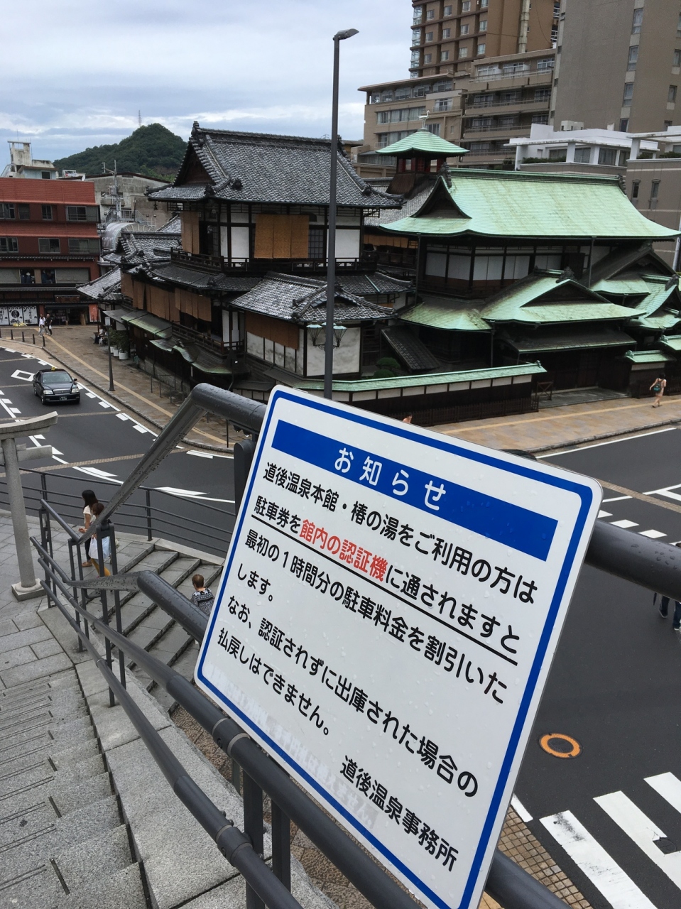 本館に隣接する高台に道後温泉駐車場があり温泉利用者は1時間無料で利用できます。平日の午前中は駐車車両が20台もなくがらがらでした。高台の駐車場から本館へ下りて行く時に建物の全体像や街並みが見渡せるのが良いです。