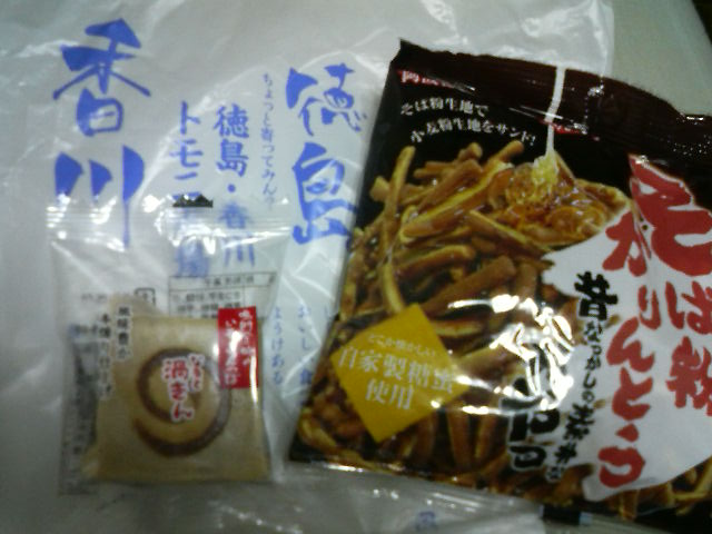 徳島・香川両県の名物を豊富にとり揃えてる中、この日は「なると渦きん」「そば粉かりんとう」などを購入。