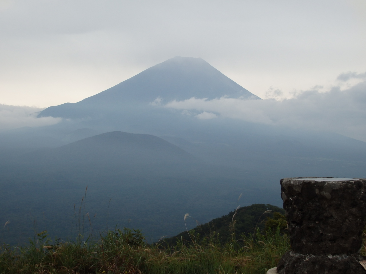 パノラマ台下バス停から割りと急な登りを登って30分ほど緑きれいなブナ、ミズナラ林を通過。気持ちの良い登山道を進む。更に富士山が見える絶景ポイント通過。バス停から1時間10分でパノラマ台山頂(1328M)に到着。南に富士山、富士山左手前に青木ケ原、右下に本栖湖等が見えます。本日も富士山に出会えました。曇りのため綺麗な富士山では無いですが、見えるだけでも良しとしなければなりません。昼食後割と急なくだりが続く本栖湖バス停に下りました。ゲンノショウコ、ハナイカリ、アザミ、ノコンギク、シモバシラ、コウヤボウキ、アキノキリンソウ、トリカブト、キバナアキギリ、オクモミジハグマ等の野花にも出会えました。本日のコースは標高差が約400Mでありアプウダウンも多くなく、土面が多く、歩き易い年寄り向きのコースでした。満足できる登山でした
