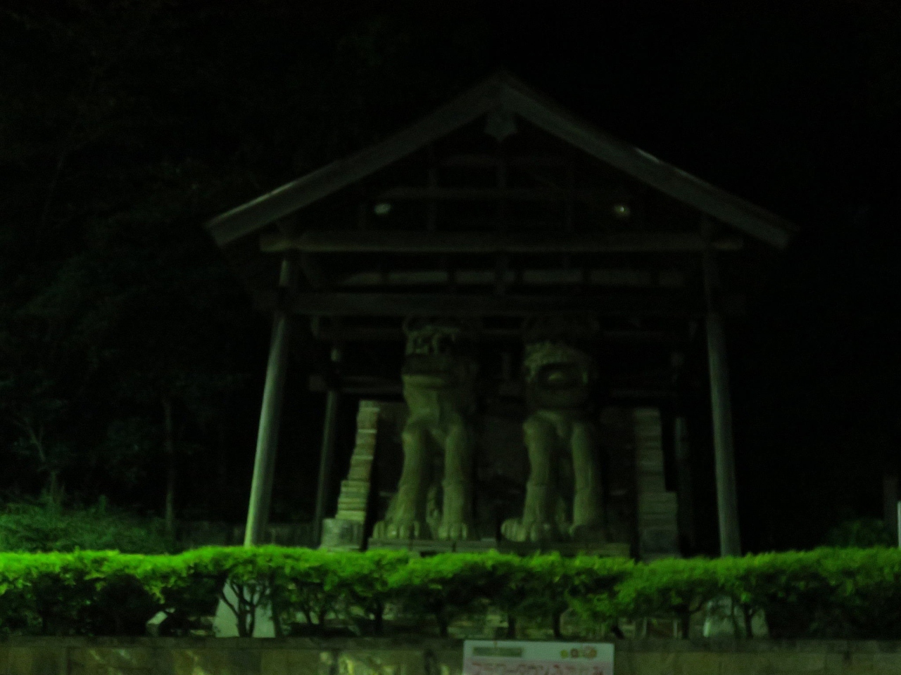夜だったので、闇夜に浮かぶこま犬さんが悪魔悪魔らしく見えるか!と思ったが、目の前の道路の照明の光があってグリーンな感じだった。