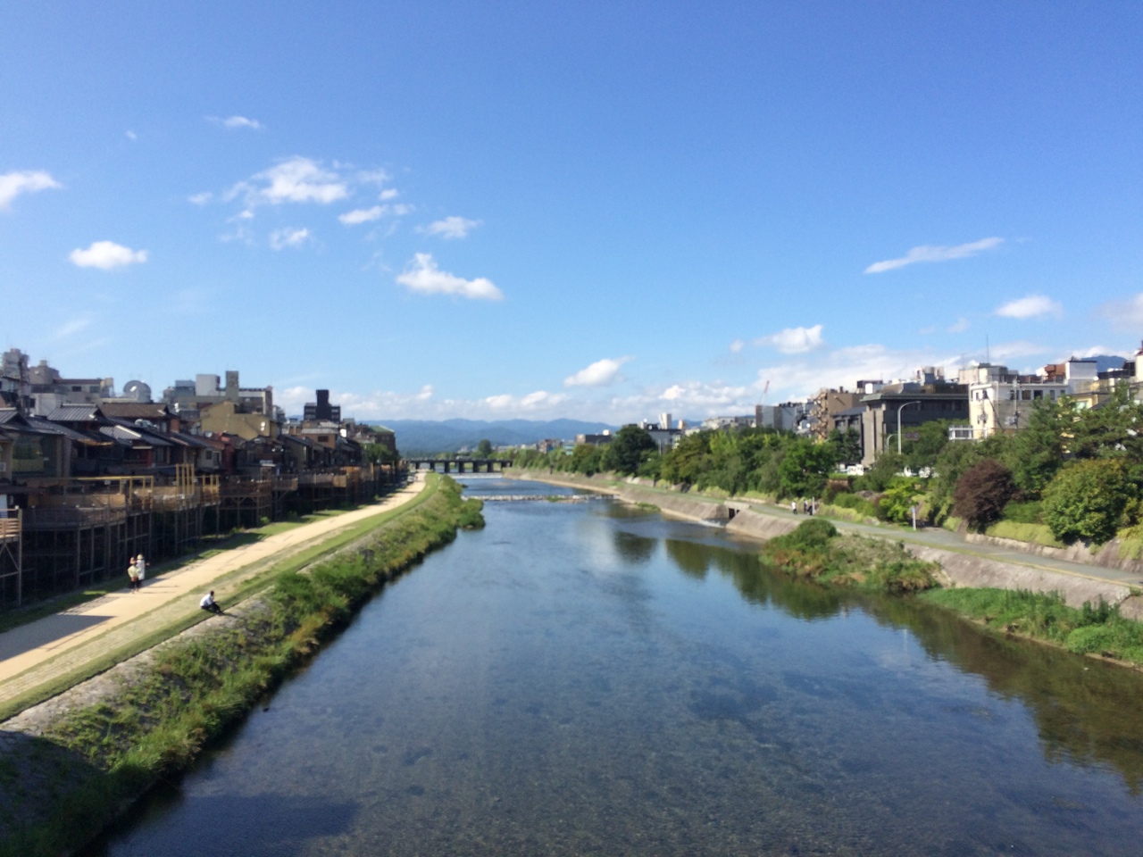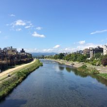 日中でとても良いお天気で気持ちよかったです。観光客の写真スポットのようです。カップルが等間隔に座って過ごす姿を見ると、鴨川だなーっ等間隔思います。お金をかけずに過ごせるスポットです。夏は、鴨川沿いの飲食店で川床が楽しめるようです。