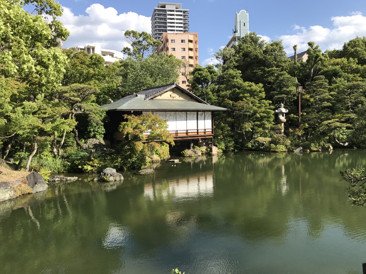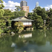 相楽園の中にある日本庭園の池のそばにたたずむ茶室です。戦災で焼失してしまったようですが、戦後復元されました。普段は中に入ることはできませんが、茶会なども開かれているようです。池と緑の中に静かにたたずむ和風建築は外から見ているだけでも心が和みました。