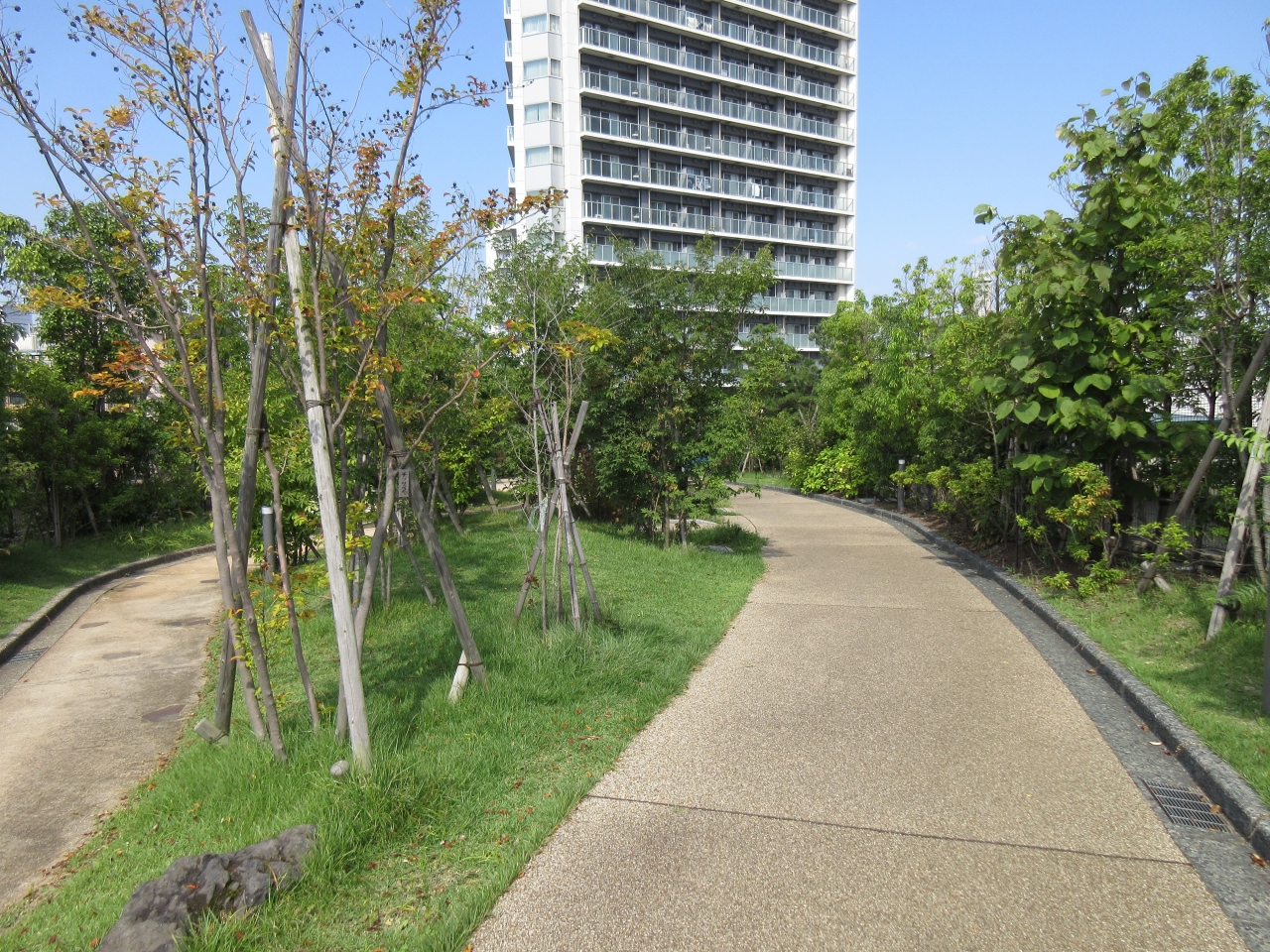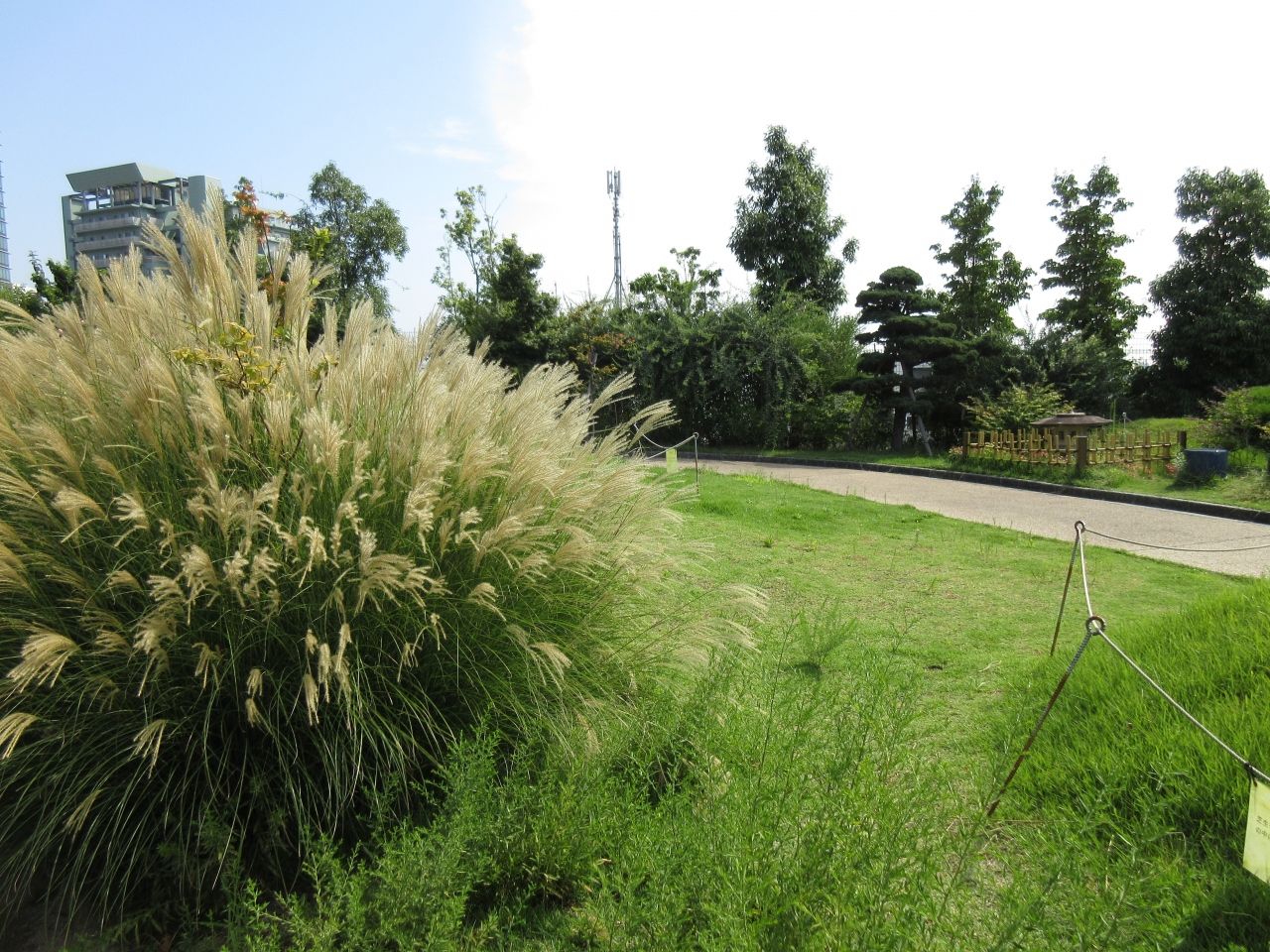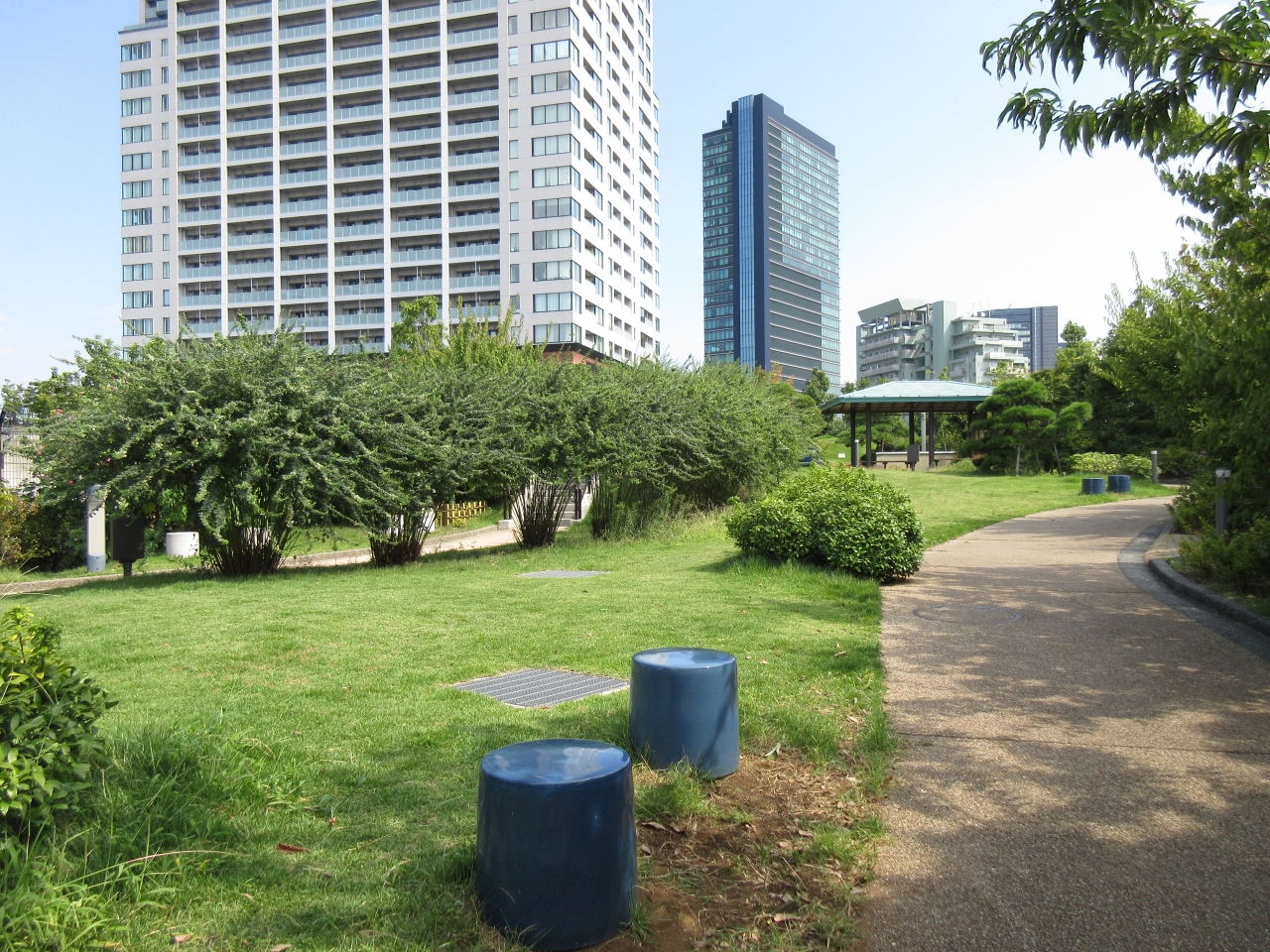 大橋ジャンクションの屋上に造られた緑豊かな庭園です。首都高速の大橋ジャンクションは何度も利用していますが、庭園は初めて訪れました。高速道路の上にあるとは思えない、落ち着いた雰囲気が感じられる庭園で、ぶどう棚や立派な赤松、黒松、五葉松などが芝生の中に植えられています。ベンチや東屋も作られているため、草木に囲まれのんびり過ごすことができます。高速内を走る車の音は全く聞こえません。エレベーターで降りた1階には、人工芝のフットサルコートもあり、保育園の園児たちがコート内を走り回っていました。高速道路に囲まれているとは思えない静かな空間と庭園です。