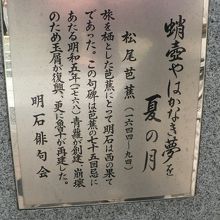 柿本神社の随身門の前(展望台)に碑が立つ。一般には「蛸壺塚」といわれ、松尾芭蕉が句を詠んだもので明石夜泊と題して記載されている。『蛸壺やはかなき夢を夏の月』と刻まれた銅版と石碑が明石の海に向かって立っている。ここからの明石海峡の眺めも良い。