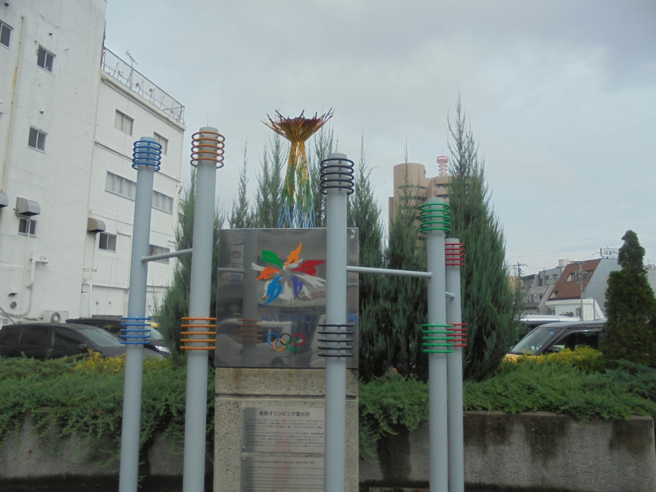長野駅から善光寺へ向かう途中、右側の道路沿いにあります。1998年に行われた長野オリンピックの聖火台があります。善光寺に向かう人たちのほとんどは、足を止めて写真を撮っていました。五輪の模様がきれいでした。