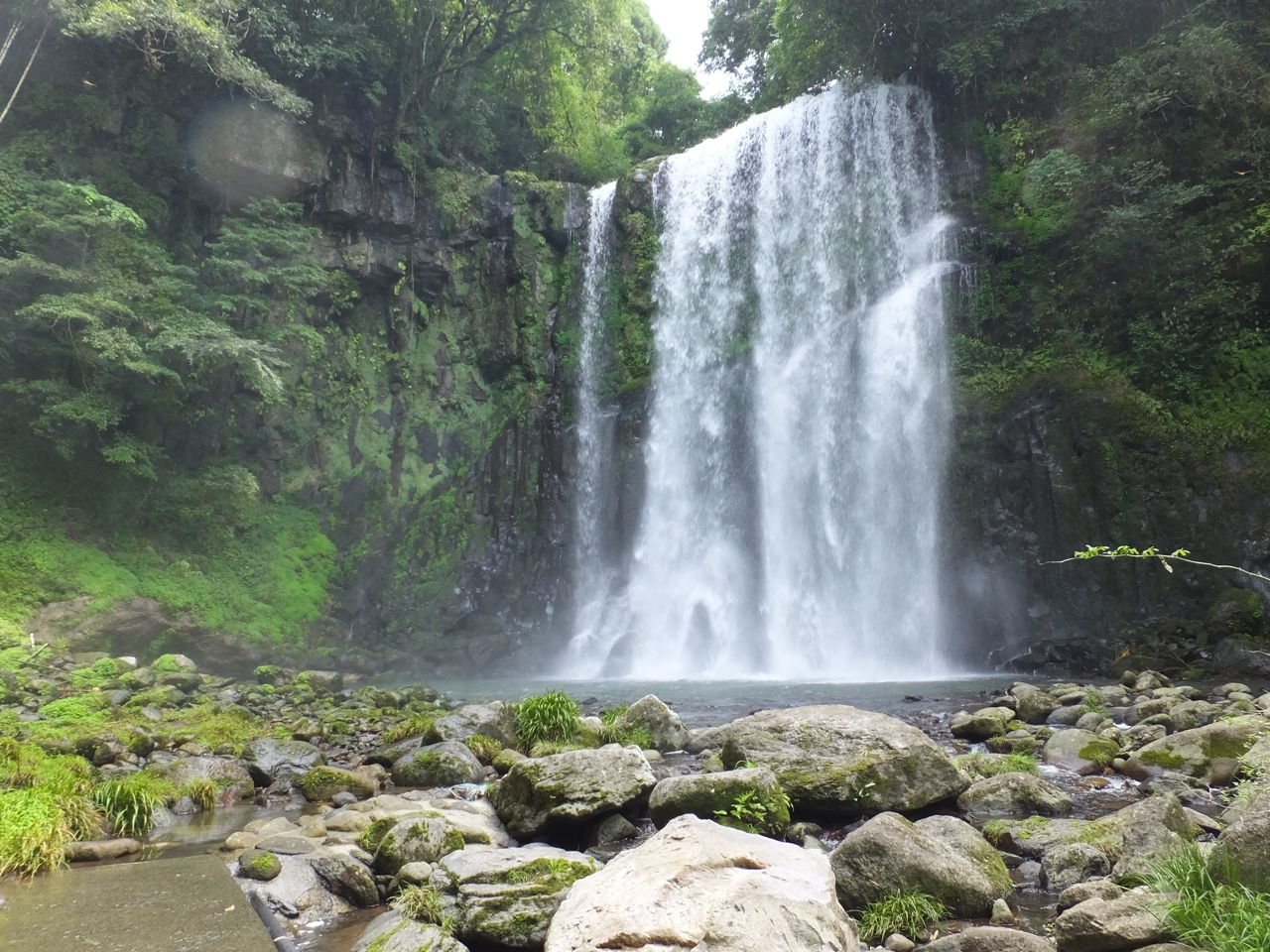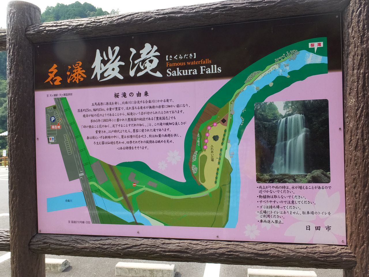 JR久大本線の天ケ瀬駅から温泉街と反対側の博多(久留米)方に歩いて山に入って散歩道の突き当たり。ものの10分もかかりません。豪勢に水煙を上げる滝は夏は涼しくておすすめです。滝壺に近いところに、更に水面近くに遊歩道があるのでミストをたっぷり浴びることができます。