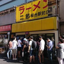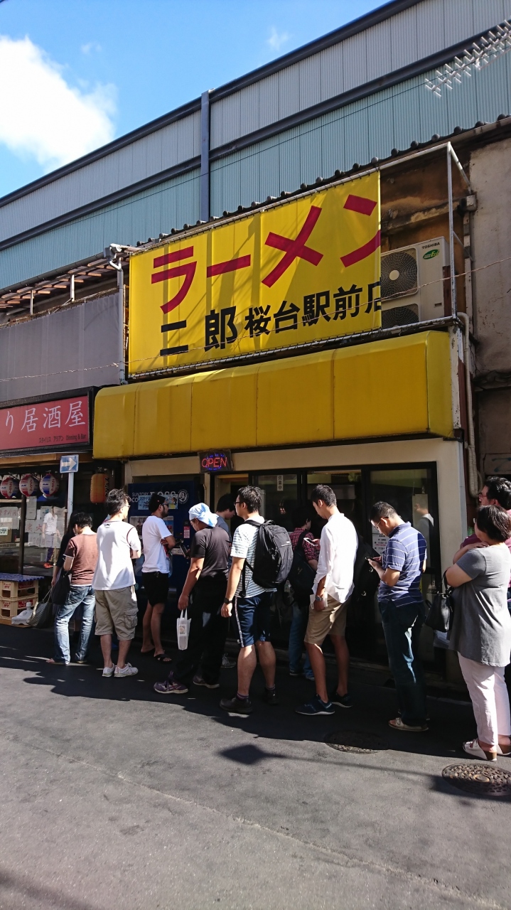 西武池袋線桜台駅南口から徒歩1分のところにあります。駅周辺で並んでいるお店はこちらだけなので、すぐわかります。ちなみに、土曜日の14時前くらいに行きましたか、20人くらいの列。なかなか進まない行列を待つこと約60分、やっと着席。カウンター席10席、半分の5席ずつで回転させているので結構待ちます。ラーメン量は、店先に書いてある通り、「小ラーメン」で普通のお店の2倍近くあり、かなりのボリューム。「初めての方は小ラーメンでお願いします」と書いてある意味がわかります。大ラーメンを頼んでいる人はいませんでした。ラーメンが出される前に「にんにく入れますか?」と聞かれます。ラーメンは「殿堂入り」とも言われる店舗だけあって、忠実な二郎。麺は極太。脂は減らしてもらいましたが結構な量(黒烏龍茶が売れる理由がわかります)です。麺を先に食べないと、後でスープを吸ってえらいことになります。叉焼は厚めの二枚。これもかなりのボリューム。野菜を増やしたのですが、さらっと入りました。お店には「割り込み禁止」、ラーメンの撮影はオーケーですが、厨房や店員さん、他のお客さんが写り込む撮影は禁止などルールがあり、明確にしてくれるところは好感度アップ。飲み物持ち込み自由なので、店頭の自動販売機の黒烏龍茶を買って入るお客さんが多くいました。レンゲはありません。 店の外観、店内ともに「ラーメン二郎」でお馴染みの感じです。食べ終わったら食器をカウンターに、フキンでテーブルを拭くと言う暗黙のルールがあります。