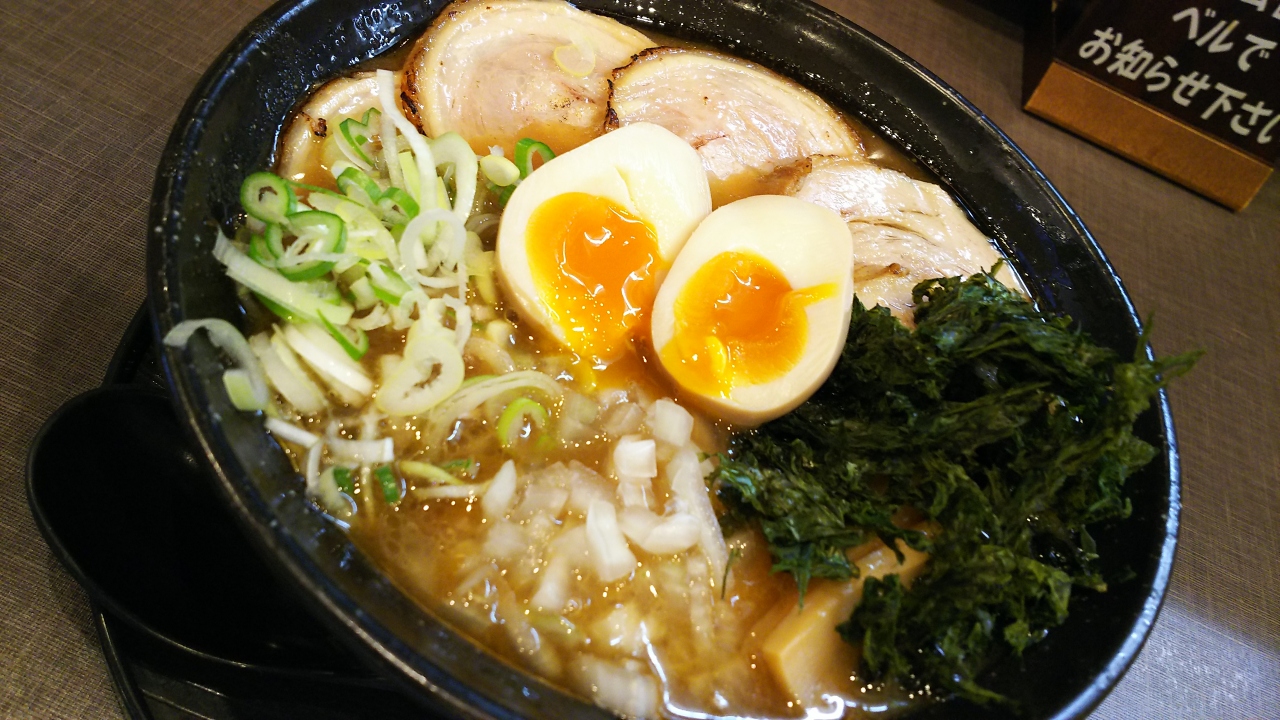 中身は岩のりに煮玉子とチャーシューと刻んだ玉ねぎ、メンマ」、ネギ。スープはやっぱり濃いめの魚介豚骨、特濃にしたのでトロリと濃いですが、好きな味です。(苦手な人もいると思います)