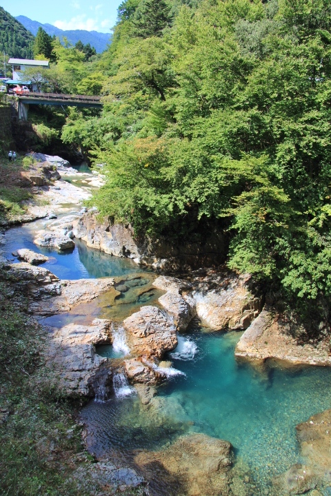 国道353号線沿いを流れていて国道からもエメラルドグリーンの清流を見ることが出来ました。また、四万の甌穴群では川岸に下りることが出来ます。そこからもエメラルドグリーンの清流を見ることが出来ました。四万の甌穴群では無料駐車場も完備されていて観光の便が良いところも利点だと思われます。