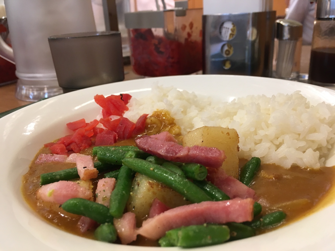 ジャガイモがゴロゴロとカレーに浸り、そこに厚切りハムとインゲンマメが彩りを添えている。なるほど、ジャーマンポテトだな。