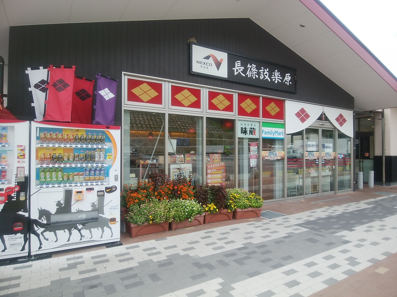 新しくできた新東名のパーキングのため、施設内はとてもきれいでトイレも使いやすく切りでした。施設内にはファミリーマートがあり、地元のお土産も販売していました。自動販売機も、下り線同様長篠の戦いと思われる図柄になっていました。