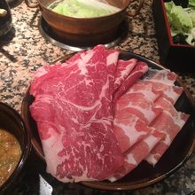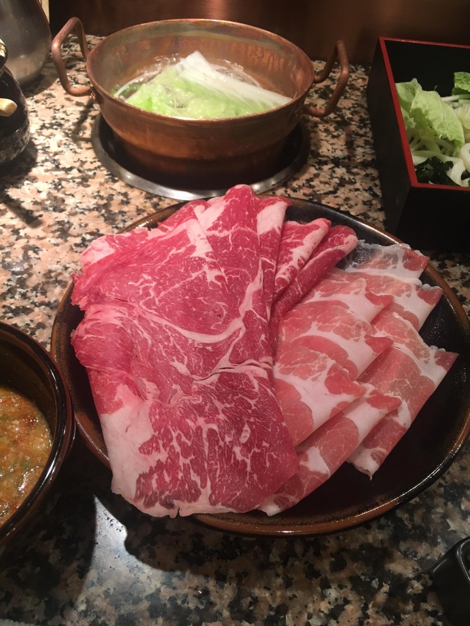 出張で梅田に行けば食べたくなる、豚と牛肉のミックスしゃぶしゃぶランチ。ごまだれにネギをたっぷり入れ、一味で味を調整して食べるのが最高。ランチなのでニンニクは投入できないが、一人用の鍋で自分のペースで満喫。最後のうどんは追加料金ののだしを注文するのがおすすめ。