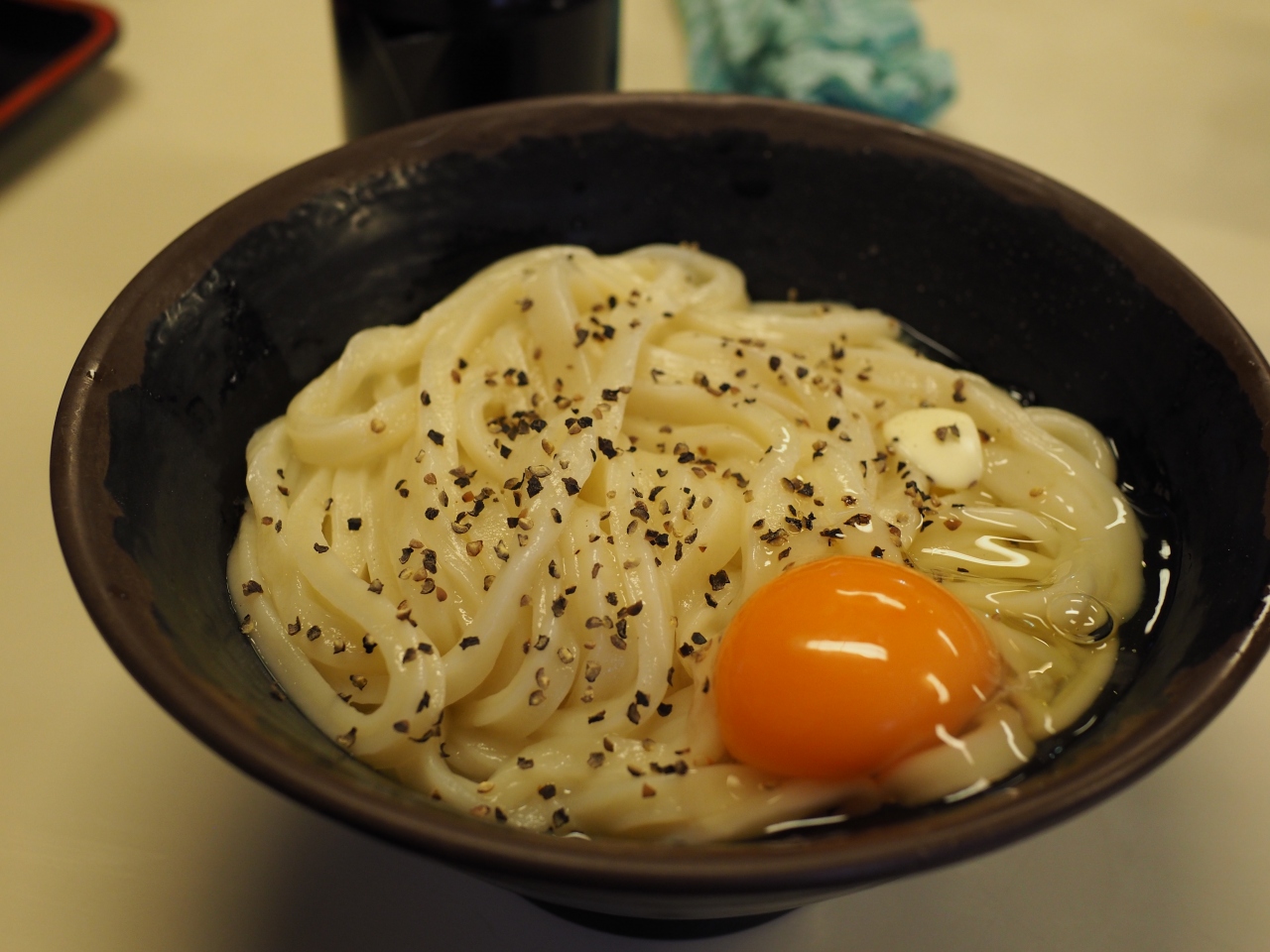 高松市内にあり電車でもいける場所にありながら、本格的な手打ちのセルフうどん店です。朝6時から18時まで営業しているので行きやすいです。釜バターといううどんが看板メニューで、たっぷりの玉子とバターに粗挽き黒胡椒が効いています。カルボナーラのようなメニューですがそれでもうどんの主張が感じられて絶品です。