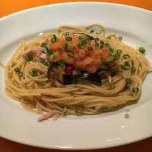 ナポリタンにミートソースがかかっている男前なパスタと迷いましたが、鶏肉と茄子のもみじおろしパスタで。美味しかったです。