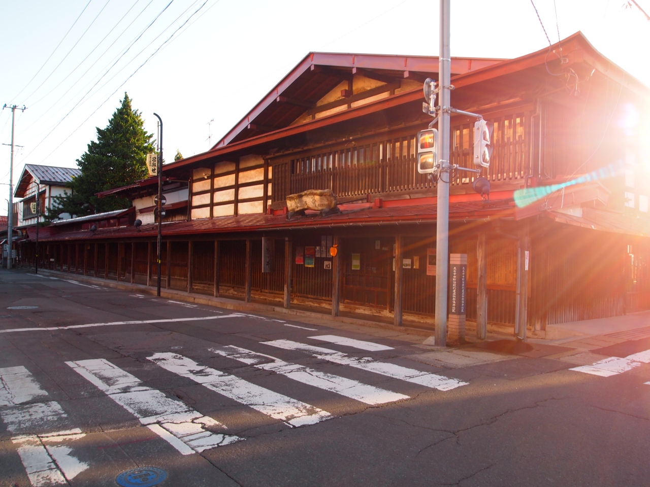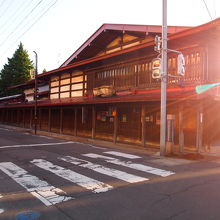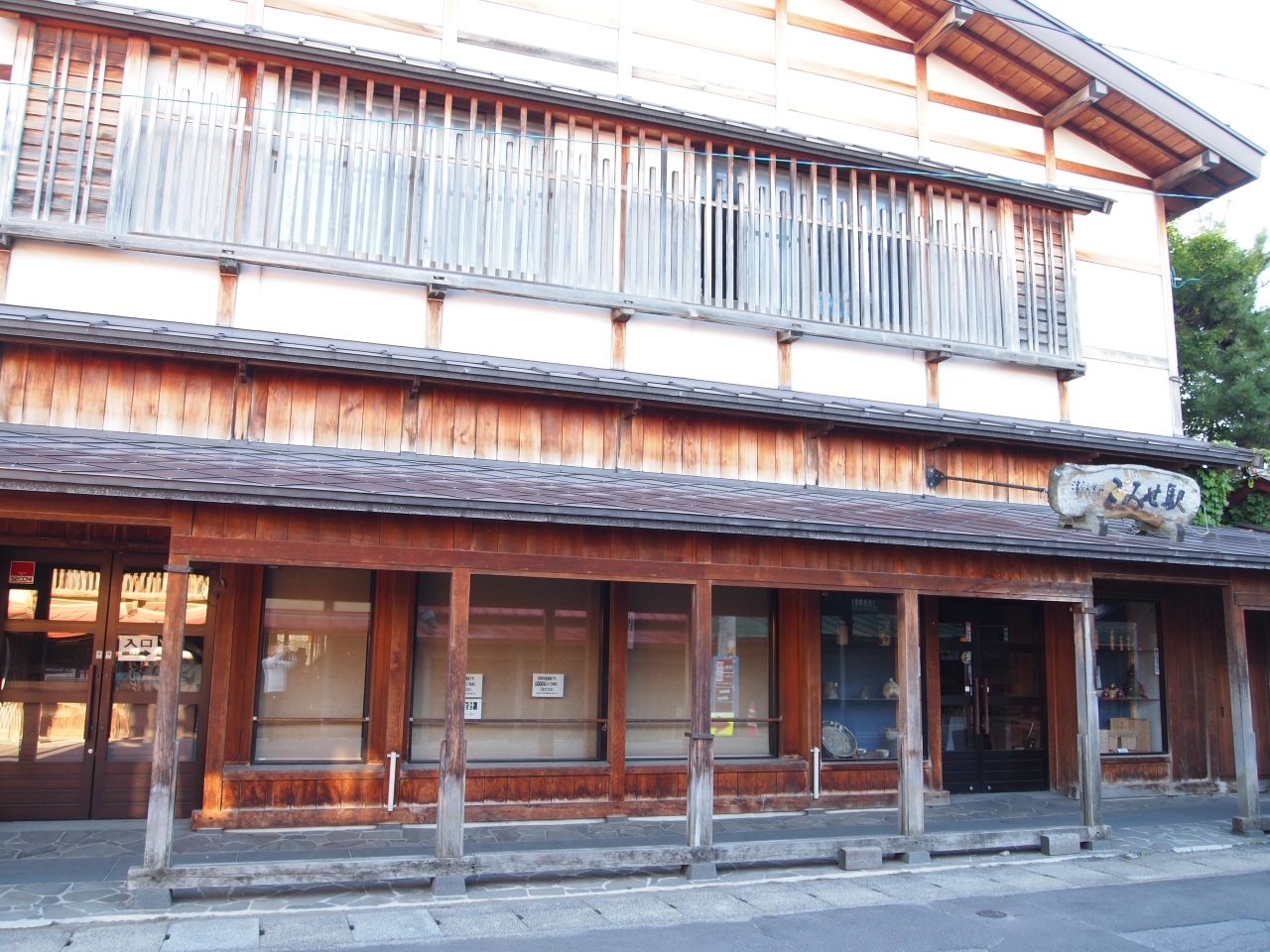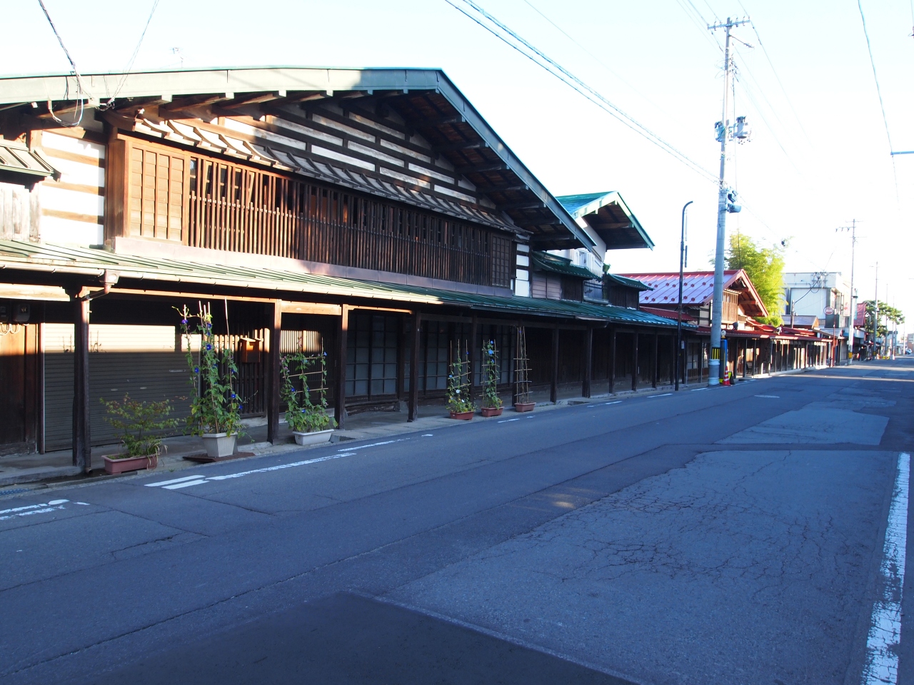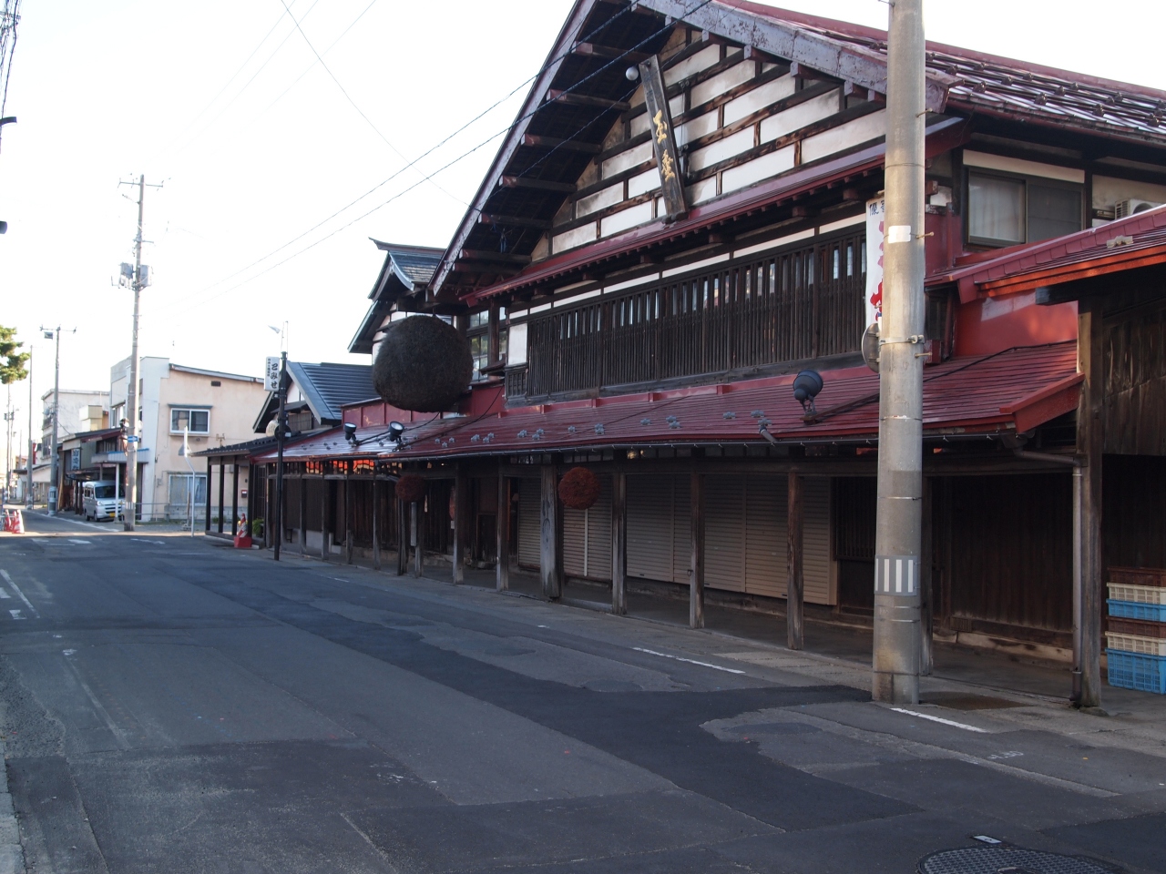 雪の日でも歩きやすいように、軒先を長くして歩道にした昔からある商店街です。夏の日差しからも守ってくれそうです。みんな大きな店構えで、重厚な作りでした。雪国ならではの工夫なんですね。大変だと思いますが、ずっと残していってほしいと思います。