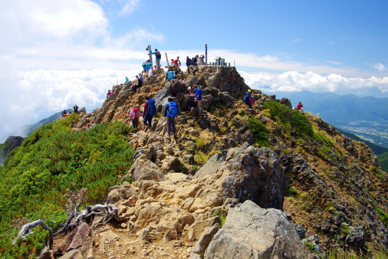 景色も最高です。今回、登りは中岳道を使いましたが、途中の赤岳・横岳・阿弥陀岳の眺めも素晴らしいです。頂上付近からは遠く諏訪湖まで見晴らすことができました。