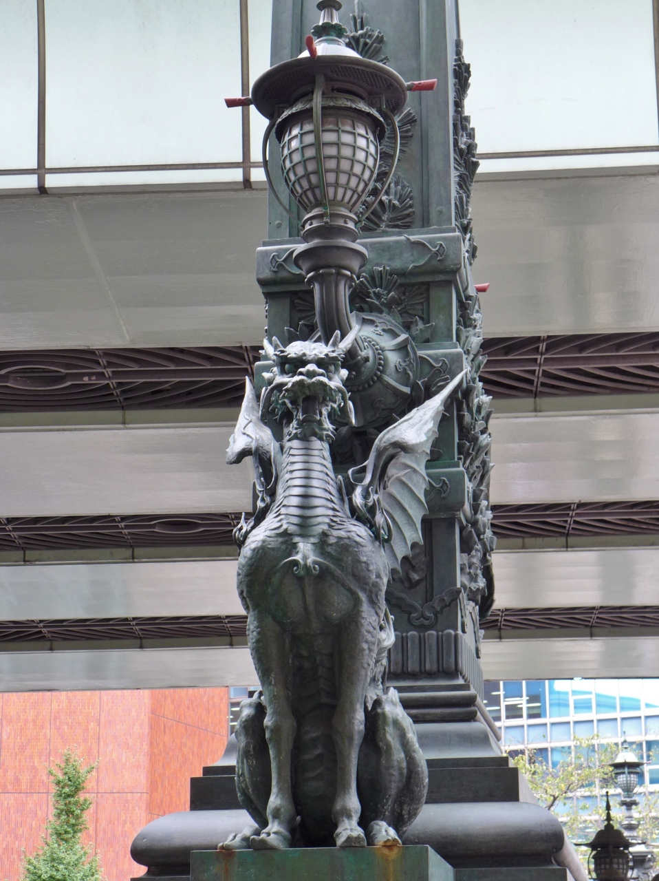 橋の中央欄干にある支柱には恐竜のような像がありました、これはビールのラベルでお馴染みの麒麟だそうです。厳めしい顔と胴体には翼が生えていてなかなかの迫力でした。それにしても上を走る高速道路が鬱陶しいです。
