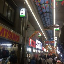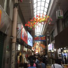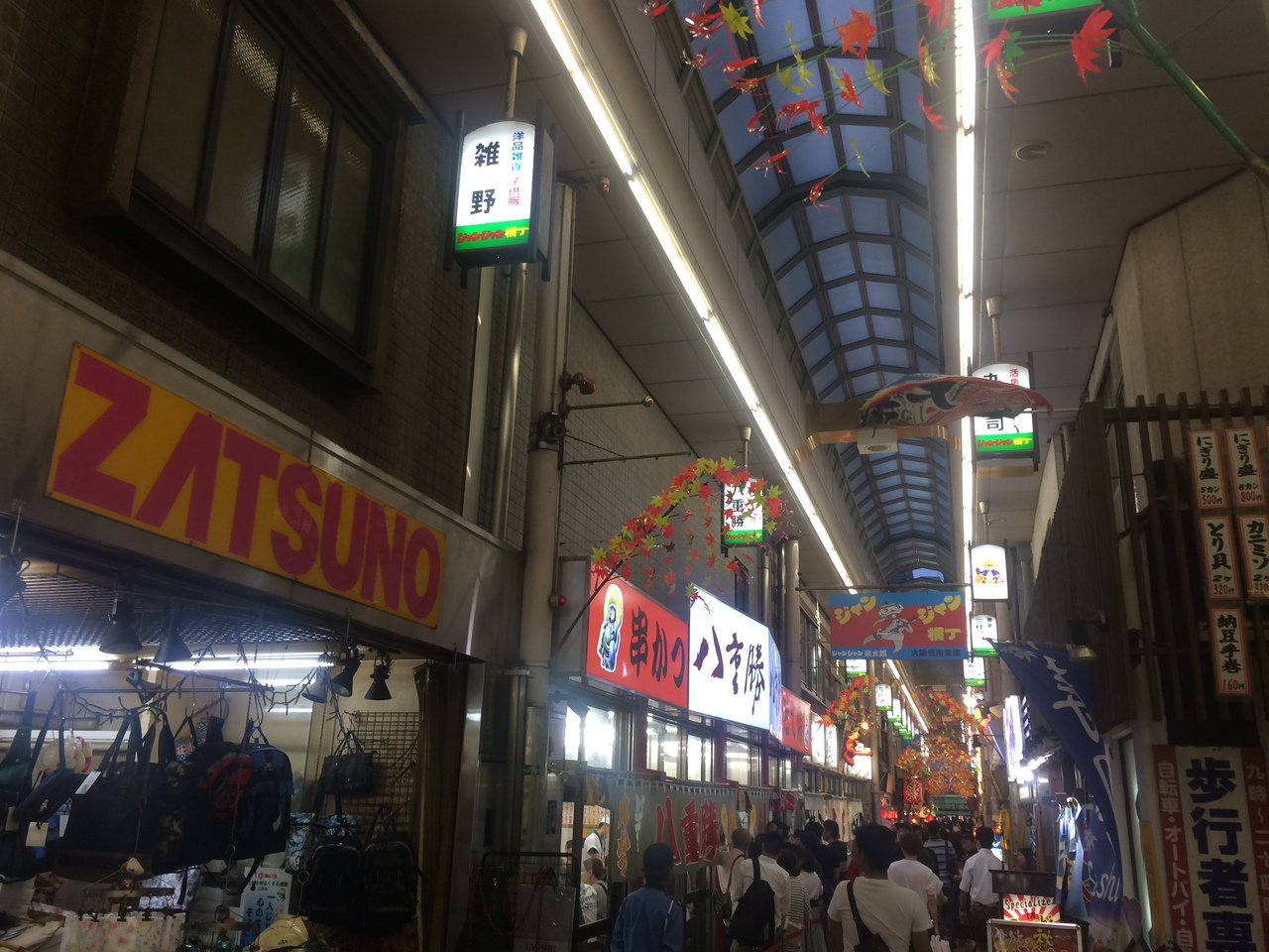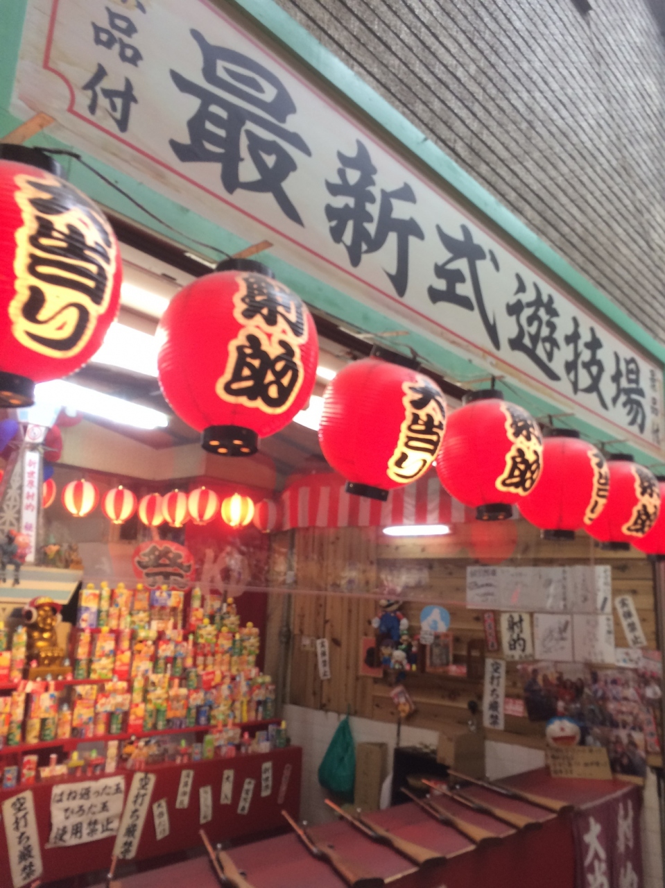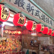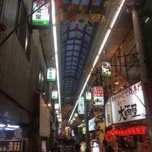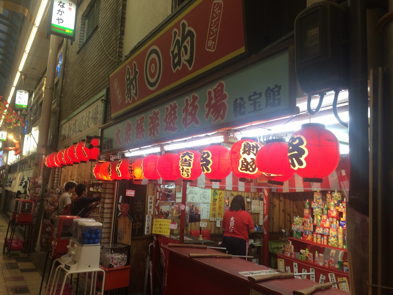 300メートルぐらいあるでしょうか。アーケード沿いの細い通りに店が立ち並び人でごった返ししています。串カツ屋、射的屋、将棋囲碁屋、寿司屋、ゲームセンター等ありどの店も賑わっていました。テーマパークのような通りでした。