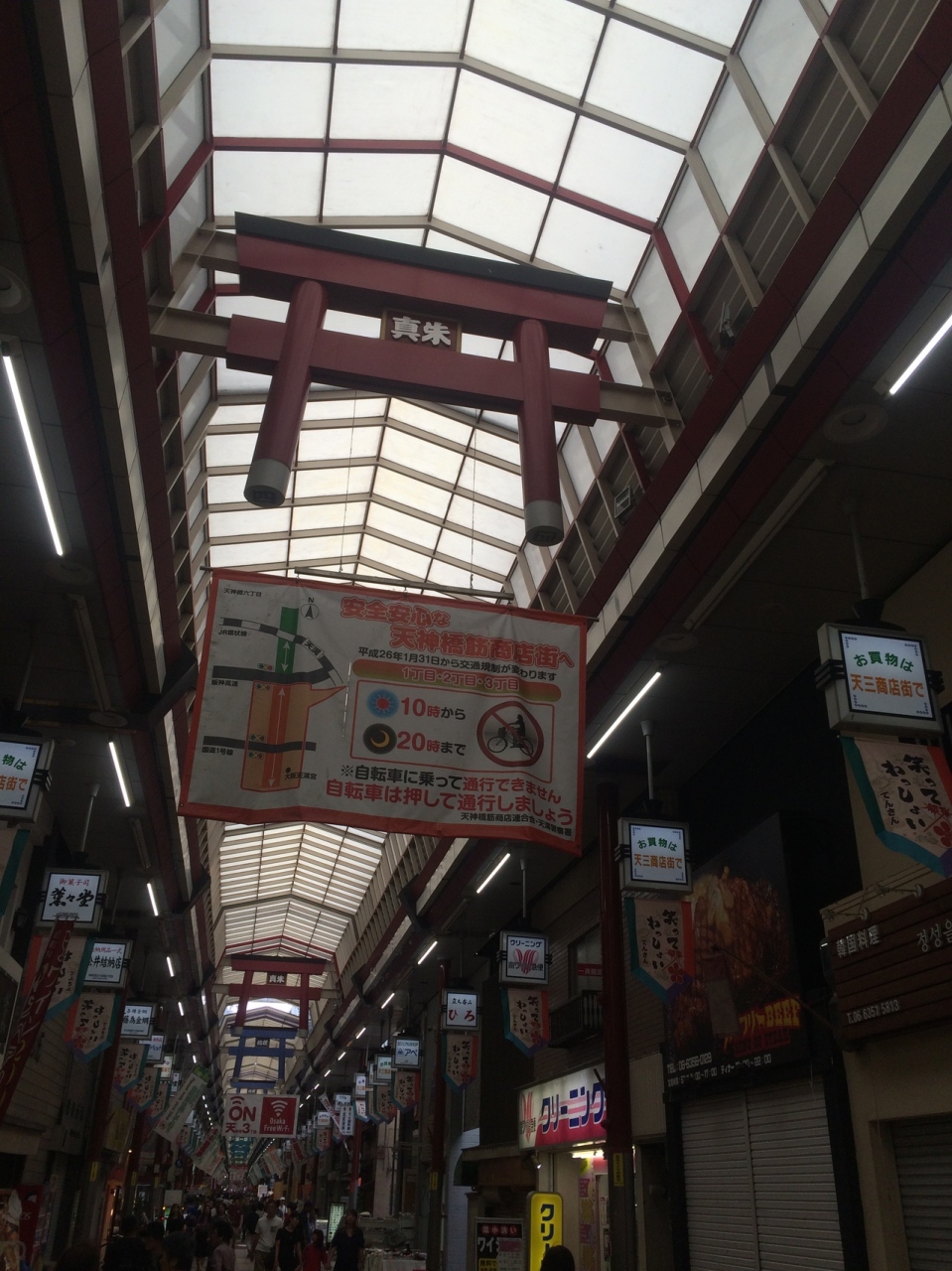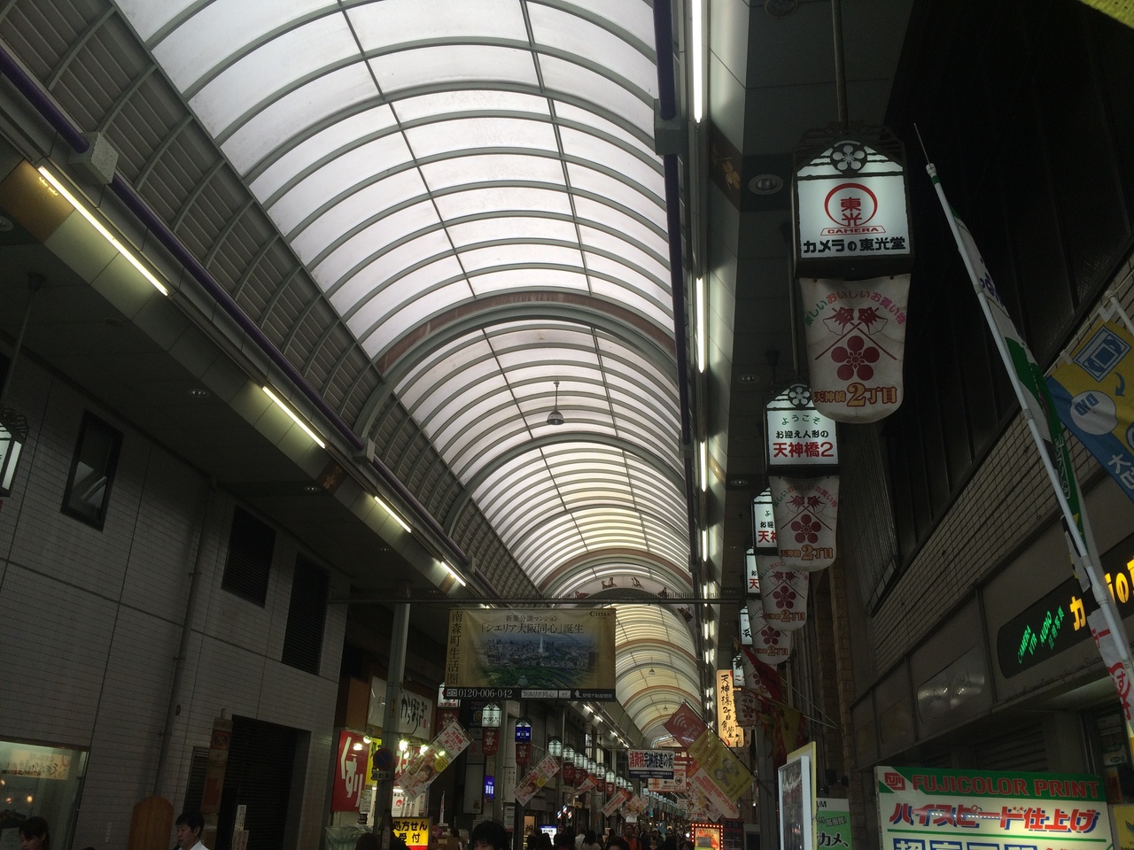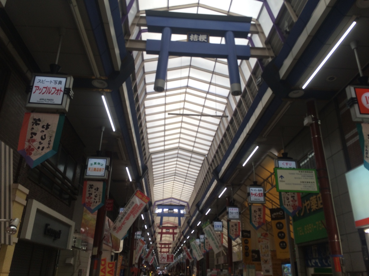 南森町駅前から長いアーケードになっていて商店街が連なっています。上を見上げると大阪天満宮に近いせいか、鳥居の形が連なり赤と青の色のものがありました。アーケードが長いため途中ところどころ脇道があります。