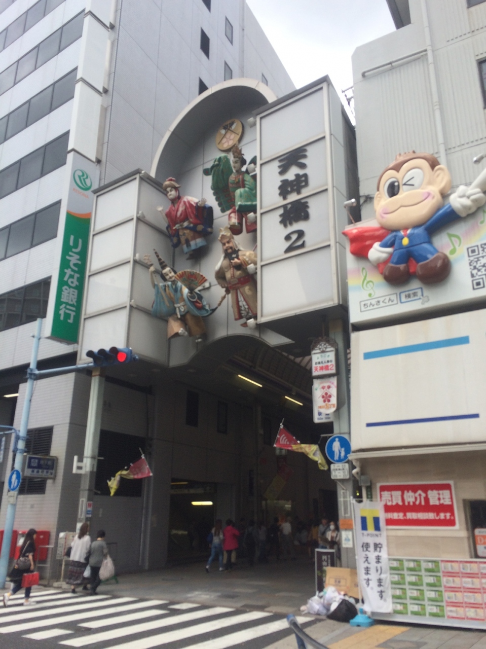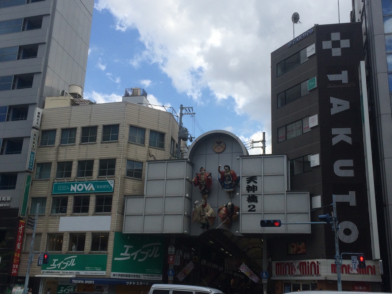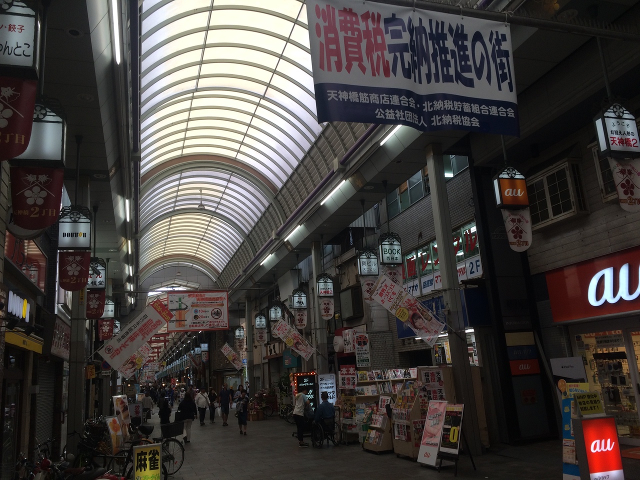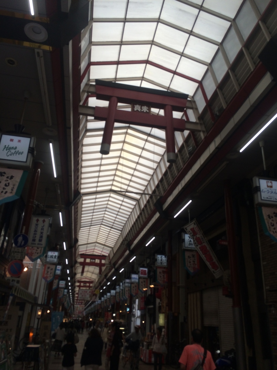 南森町駅前から長いアーケードになっていて商店街が連なっています。上を見上げると大阪天満宮に近いせいか、鳥居の形が連なり赤と青の色のものがありました。アーケードが長いため途中ところどころ脇道があります。