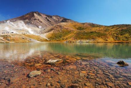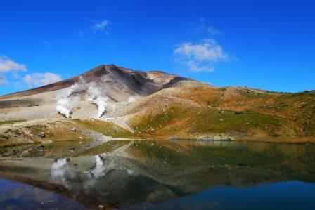 ロープウェー姿見駅から散策路を歩く途中で見える旭岳は、火口を中心にV字型に頂上を開いている勇壮な姿で目に強く迫ってきます。ですが「最終目的地」となる姿見の池の展望台に立つと、水面は旭岳火口の正面下にあるわけではなく、少し右寄り。このため水鏡に映る旭岳の姿はやや焦点を欠いた印象になります。それだけがちょっと残念。