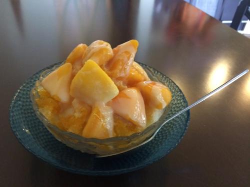 注文はマンゴーかき氷です。上のマンゴーはまだちょっと凍ってました(でも夏なので丁度いい)。