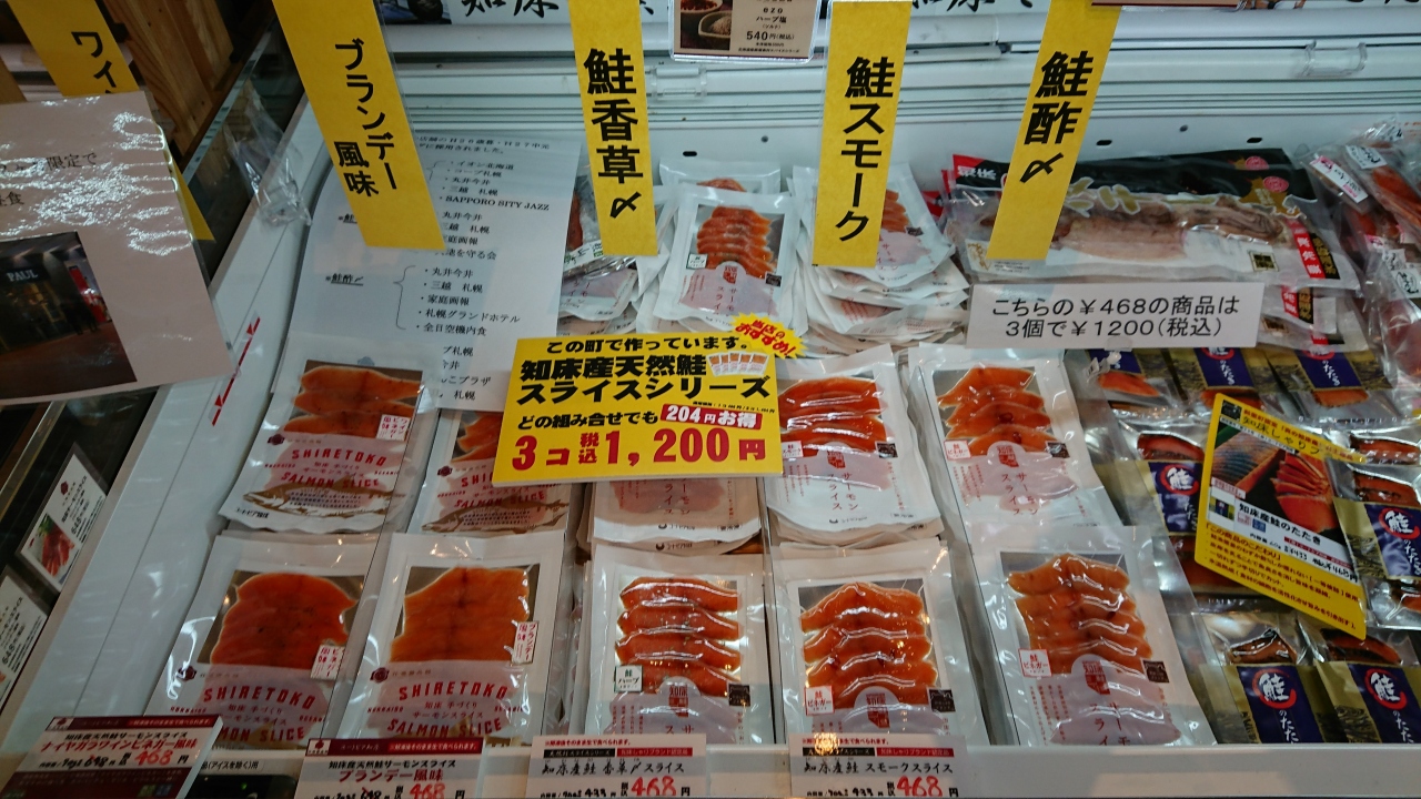 知床観光の拠点として知られるウトロの中心部にあります。天然の鮭をさまざまな方法で加工した食品が販売されていました。中には、ブランデーや香草を使ったものなど、洋風のものもあり、お土産にすれば酒のつまみによさそうです。