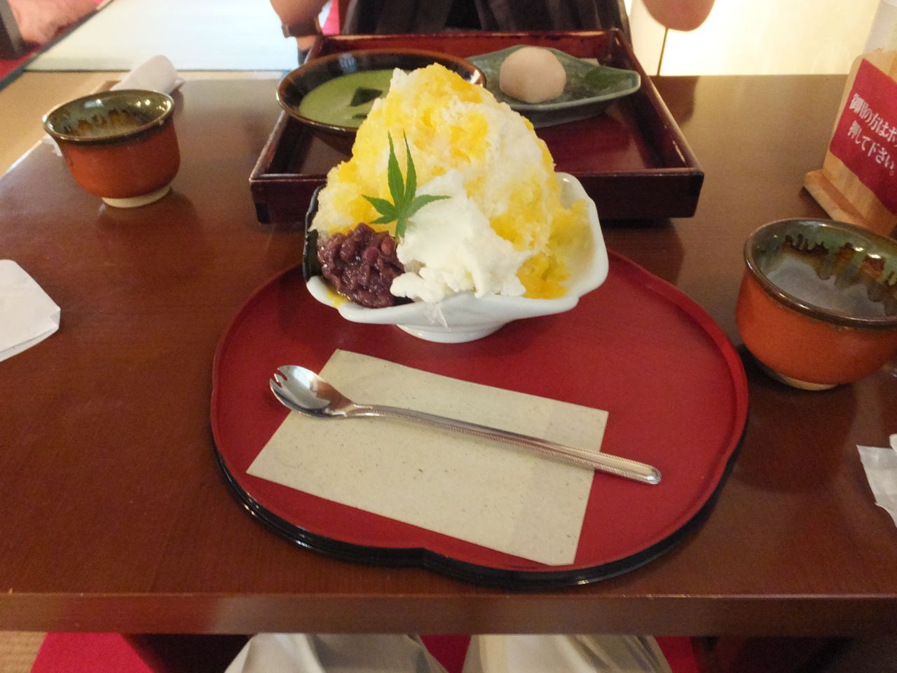 能見邸の前にメニューがあって、うどんなどの軽食から松花堂弁当もあるのでランチにもいいです。そして暑い日はやはりかき氷やパフェなんかもいいです。今回は夏季限定の柑橘のかき氷をいただきました。