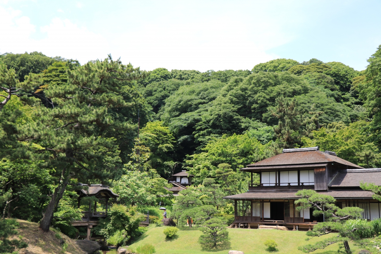 多くの古民家や自然が残されている庭園です。中では写生している方や結婚式の前撮りをされている方がちらほら。