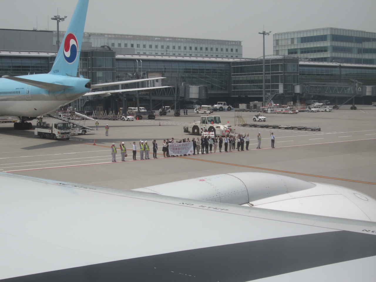 JAL便に搭乗して、羽田空港で機体が駐機場を出て、滑走路に向かう際、窓の外を見ていると職員の方々に「ご搭乗ありがとうございます」のメッセージを受けて出発しました。JALに入社した社員たちによる思い出に残る素敵なサービスでした。