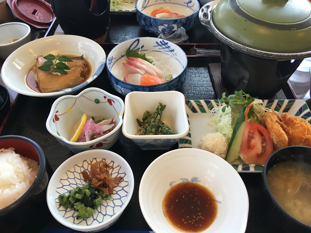 1階はお土産屋であとはお食事処が各階にあり、最上階です。ランチはいくつかありますが、日替わりが安くてボリュームたっぷり。もちろんお刺身あります。店内は昭和な感じで楽しいし、海もみれてオススメです。