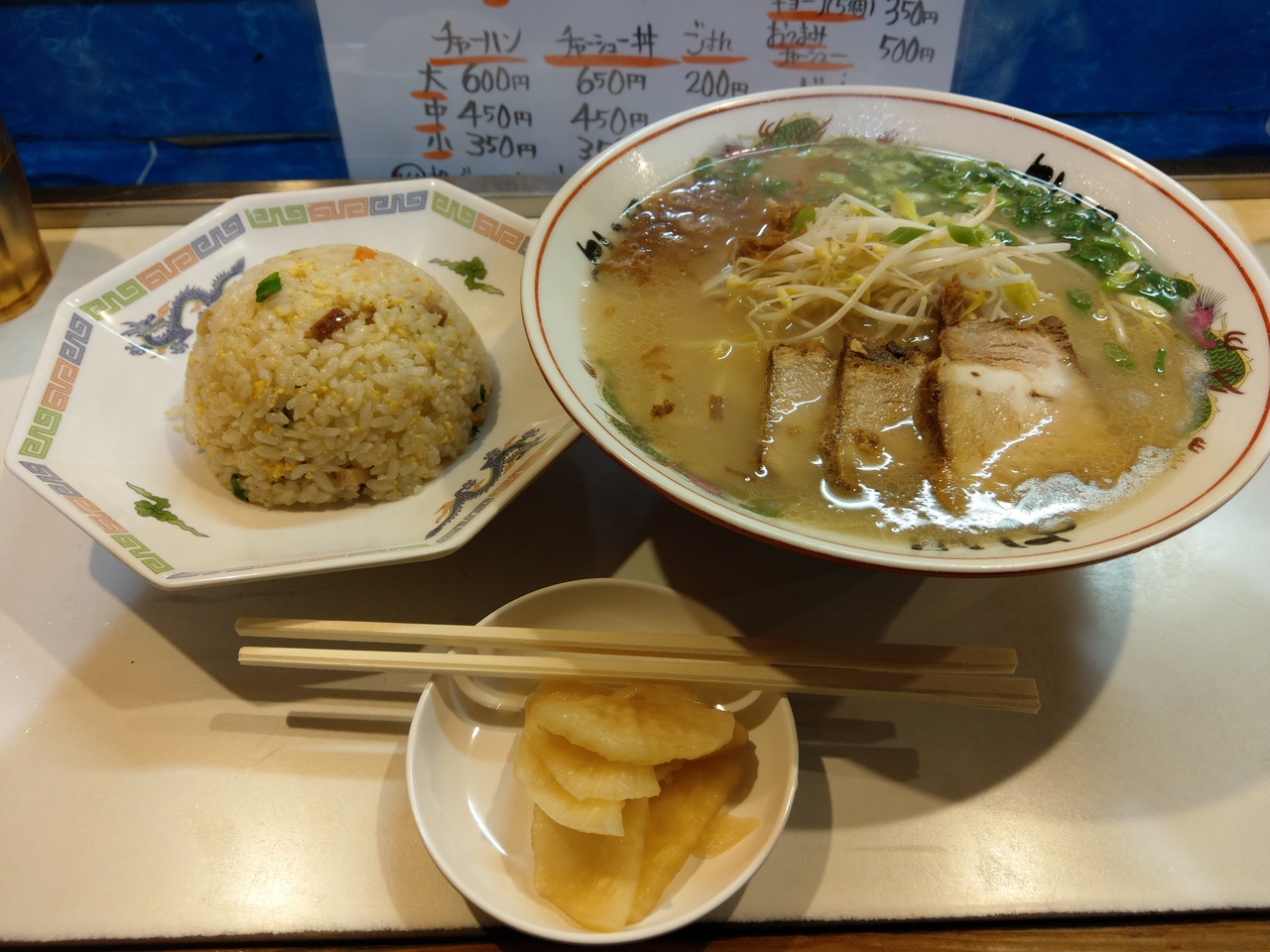 ラーメン(中)とチャーハン(小)をオーダー。ラーメンはあっさりで旨い!