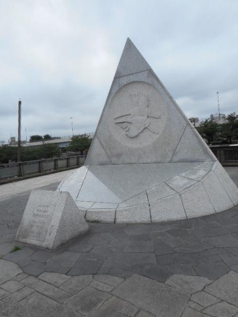 隅田川にかかる橋です。歩行者専用の橋ですので、車も通らずゆっくり渡りながら川の様子やスカイツリーの景色などが楽しめます。橋の形はちょっと変わっていて、エックス型になっていて、大きくきれいな橋です。橋の上には三角の石碑もたっていました。