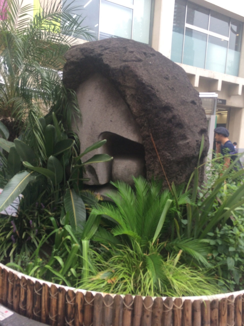 東急東横店の横にあり、待ち合わせ場所と同時に隣は喫煙所なのでタバコを吸っている人が多いです。限られているのでタバコの匂いは気になりませんでした。像は表と裏に顔があり表情はそれぞれ違います。東急東横店のれん中にはモヤイ方と言う出入口の記載もありました。