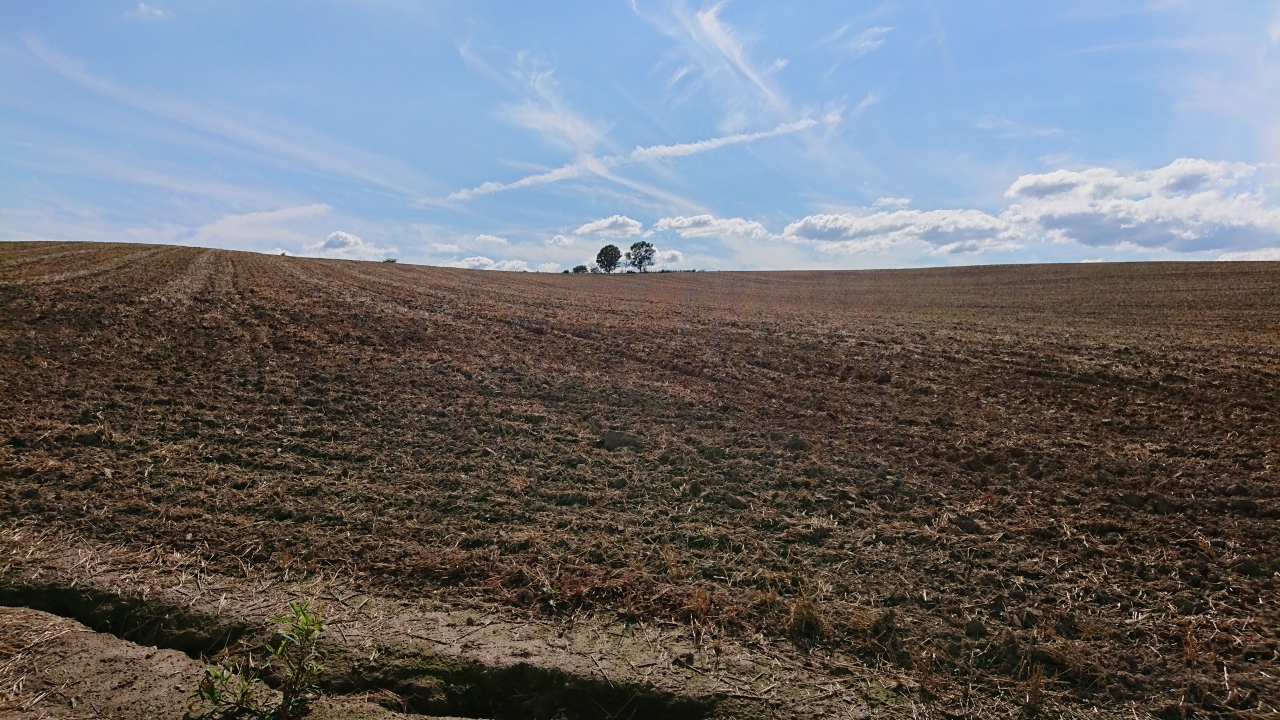 たまたま手前の畑が収穫直後だったようで土色一色。写真のような畑の緑を期待していたのですが、しょうがありませんね。観光のための畑を作っているわけではありませんから。遠く離れてみたら、地平線に浮かんで美しく見えました。