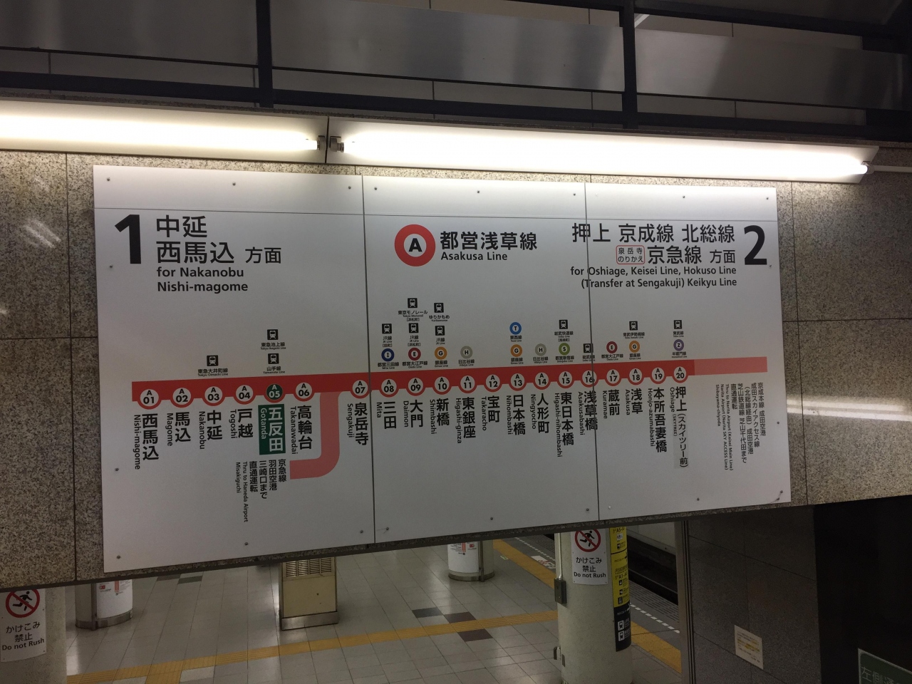 都営浅草線です。この日は五反田からスカイツリーの最寄り駅である押上まで乗車しました。この浅草線を利用すれば一本で行くことが出来ます。途中の新橋や日本橋でも。銀座線なら浅草乗り換えが必須ですが、浅草線なら同じく一本。とても便利です。京急線や京成線も乗り入れていて、羽田空港や成田空港へもダイレクトに行くことが出来ます。