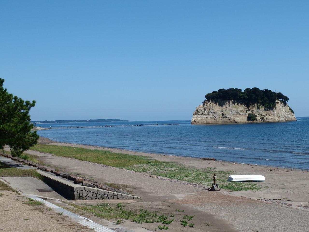 浜辺の200m先に屹立する高さ28mの四角い岩の塊である「見附島」の周辺の海岸に整備された公園です。海水浴場やキャンプ場が整備され、レストハウスや駐車場もあります。そもそも白砂青松の風光明媚な海岸なのでいい天気の日にのんびりするのにいいと思います。