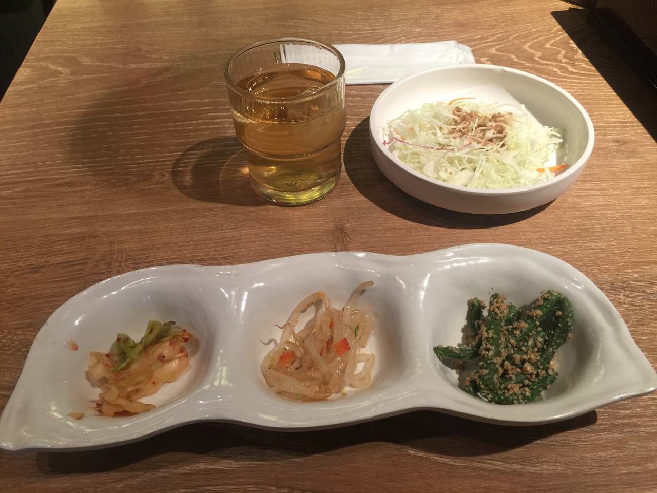 おかず3品とサラダ、海苔巻きがついて980円、、、大盛プラス100円、トッピングキムチ100円で計1,180円!