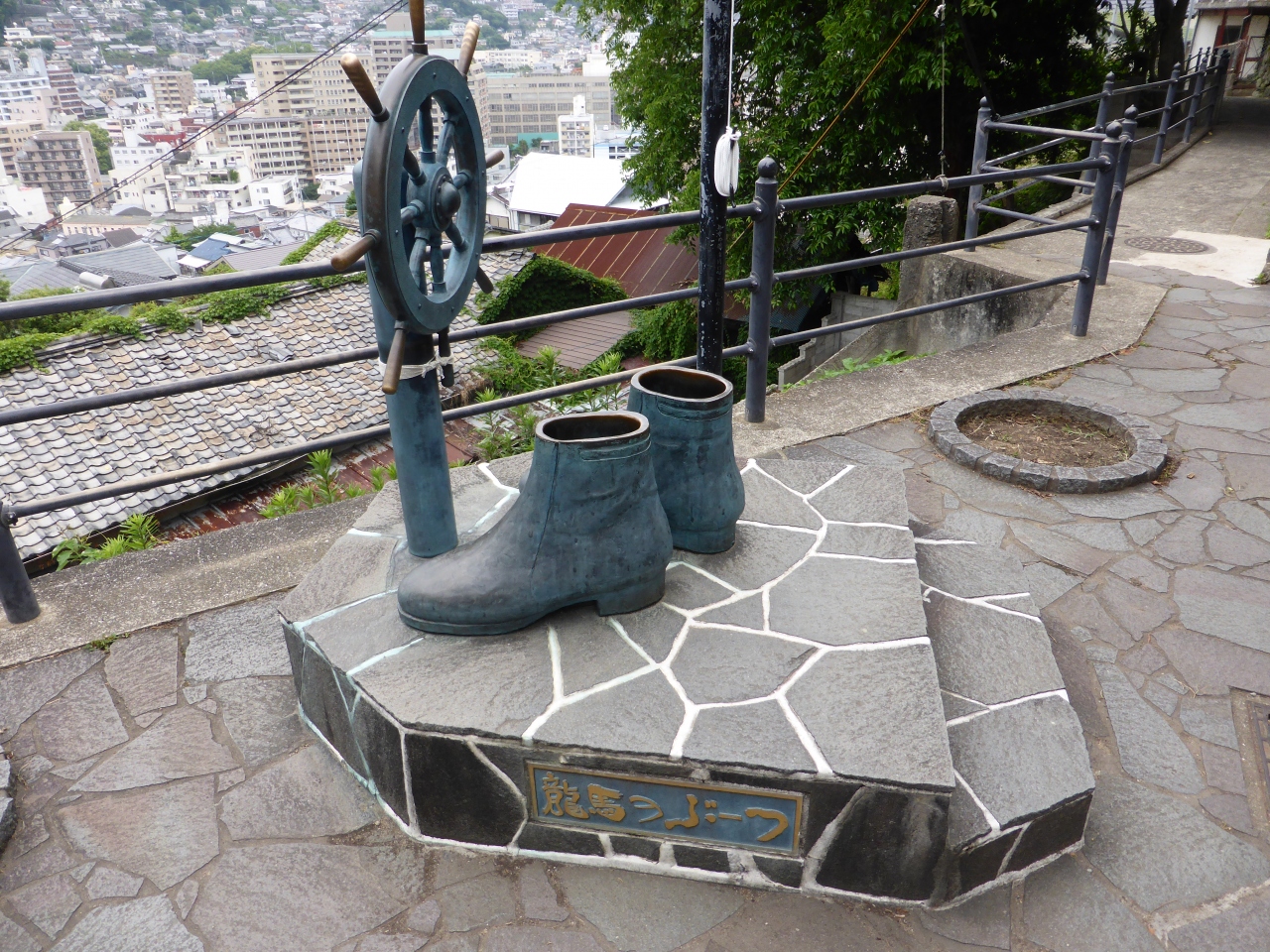 亀山社中の近くに設置された龍馬のブーツの像です。かなり大きく、龍馬が履いていた実際の大きさではないと思われます。観光客はこのブーツに足を入れ写真と撮るのが定番。ですが、モニュメントとして見ると微妙です。ただ見晴はいいいので、亀山社中とセットで訪れるにはまぁ、許せる範囲でしょう。