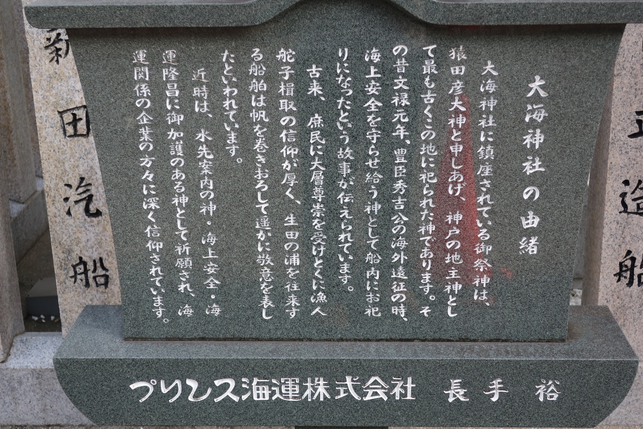 生田神社の楼門の前にある弐と参の鳥居の間にある2つある社の西側が大海神社です。港町神戸らしく、猿田彦命を祀る神社は海上安全の神様として信仰が厚く、海運関係の会社が多く寄進しています。小さな社ですが、名だたる会社が並んでいるので、ある意味見物です。