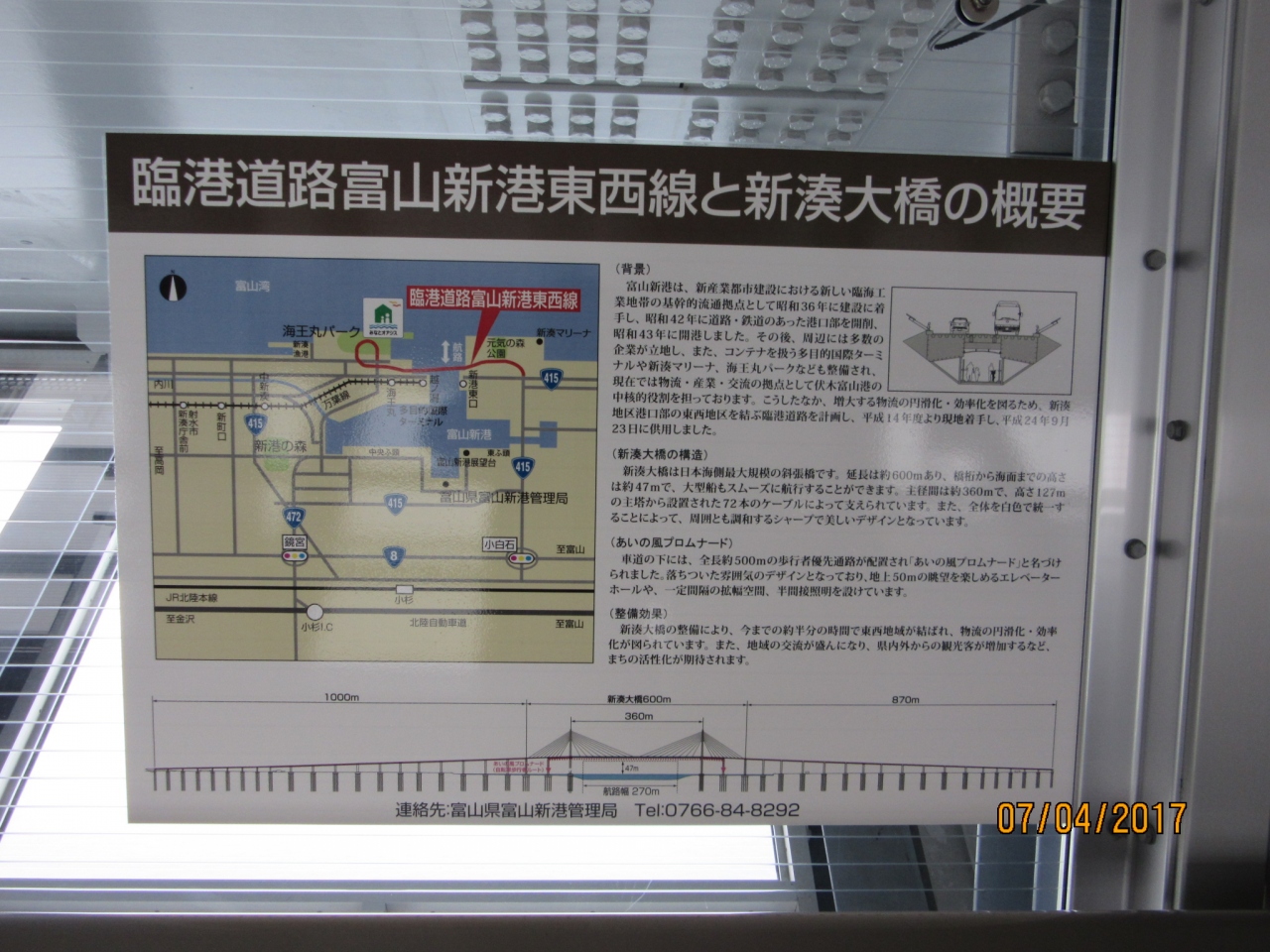 射水市の富山新港に架かる日本海側最大の斜張橋。海の上の歩道橋を渡るのは爽快であった。金曜日の昼過ぎでほとんどすれ違う人がなく遊歩道を独占して楽しめた。ガラス張りで下が見える構造。良くこんな立派な橋を作ったものだと感心した。この橋を歩いて渡り富山側に出て、帰りは県営渡船で高岡側に戻り、万葉線に乗り高岡に戻った。