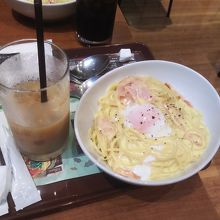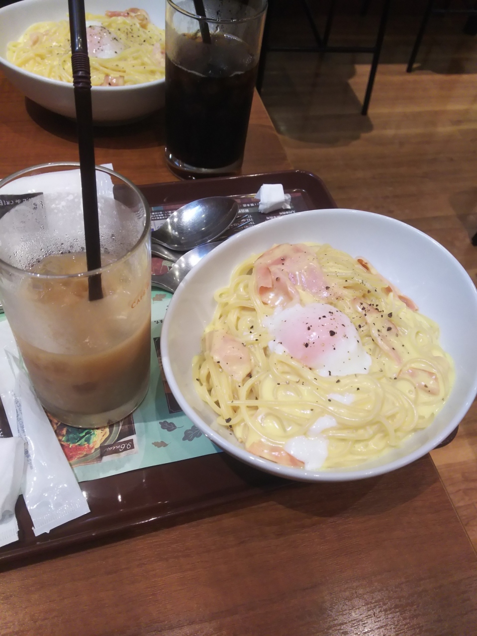 セントレアの旅客ターミナルビル4階のカフェ・ド・クリエでランチしました。ちょうどお昼時に行きましたが店内の空席は結構ありました。私はカルボナーラにプラス200円してアイスティーを付けました。ドリンク付けても以外と安く、千円超えませんでした。