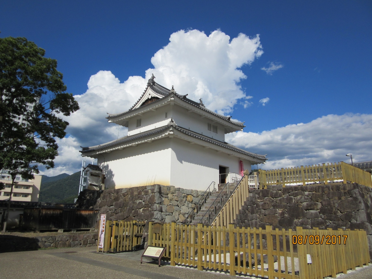 珍しいので入ってみた。入場無料で、【甲府城物語展】(テーマ=甲府城と城下町)を開催しており、城の変革や稲荷櫓の復元の過程のビデオ上映を行っていた。2階建てで元は江戸時代に武器・防具保管庫であった。城内の鬼門(北門)に位置し【うしとらやぐら】といわれた。JRの線路のすぐ横で列車の通過を見下ろすことができた。眺望はやはり天守台からが四方を見渡せるので良かった。