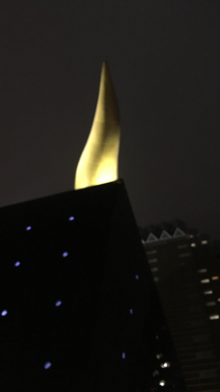 隅田川対岸の浅草からもよくみえる高層ビル。フランスのデザイナースタルクデザインの金のオブジェでも有名ですね。一般に使えるのは施設はレストランがいくつかある程度ですが、交通の便は非常によく吾妻橋や浅草駅からも徒歩圏。そして、バス停が目の前にあります。