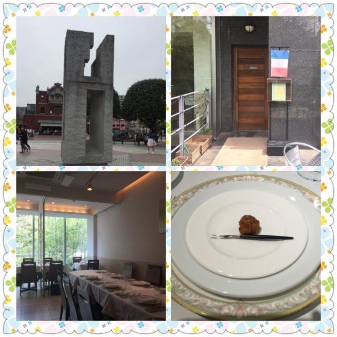 恵比寿駅より徒歩10分ちょっと? 大きなガラス窓から緑を見ながら食事が出来ます。ランチコースをオーダー。おばさま方8名程の団体がいて店内が賑やかに…少し残念でした。ランチ後に予定があり、お酒が飲めなかったのですが、ぶどうジュースをオーダーするととても濃くて美味しかったです。デザートは柑橘系で夫婦揃って苦手な味でした。