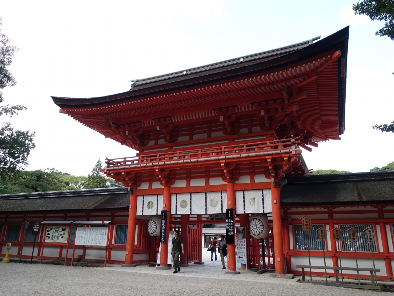 出町柳駅から下鴨神社の境内に入り、長い表参道を歩いて「南口鳥居」をくぐると見えてくるのが「楼門」です。明るい朱色の見事な建造物で、保存状態も良くとても見栄えがします。