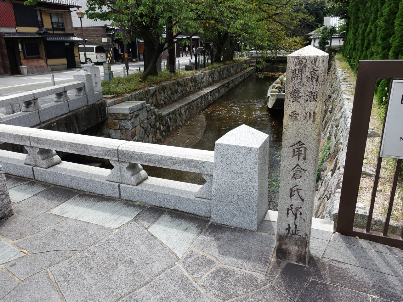 「高瀬川開鑿者 角倉氏邸址」という石柱が、高瀬川のほとりにあります。