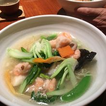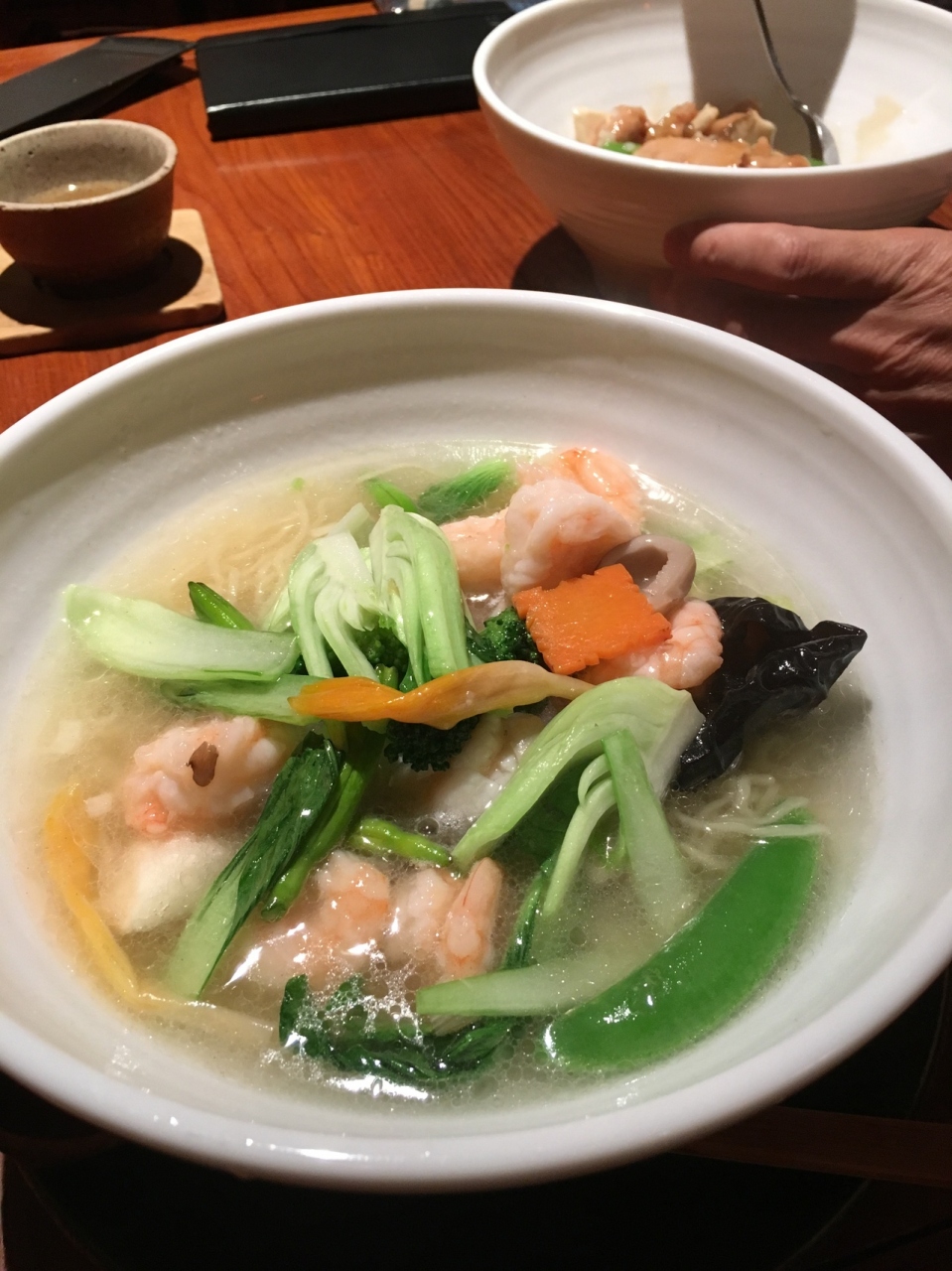 国立新美術館に近く、すぐそばにはブルーボトルコーヒーがあります。お店は地下にあり、土曜日のランチ利用の際、客層は年齢層高め。50代以上の方が多かったです。入口にあった限定30食の日替りランチとなっていた醤爆鶏丁(税込1296円)を食べてみたくて入りました。賽の目に切った鶏肉を味噌で炒めたもので、北京では、ここに胡瓜(このお店はズッキーニ)を入れるのがスタンダードと言われるもの。オーダーすると、既に売切れとのことでした。。。日替りランチにはサラダやデザートが付きますが、他のメニューは単品です。仕方ないので、海老が入ったタンメンを注文、税込1404円。あっさりとしたスープで野菜もしっかり。マコモダケが入っていてお値段もそれなりなのは納得。日替りランチが売切れた場合は、店前の案内に一言書いてあるとありがたいと感じました。