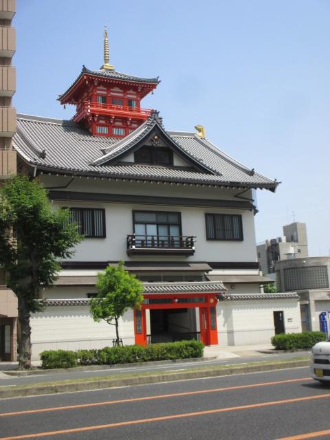 谷町筋に面していて四天王寺の近くにあるお寺です。寺門と屋根の上に付いている塔だけが朱色で、何ともユニークなお寺です。この朱色は、道路を隔てた反対側から見ないと見えません。あべのハルカスからの100円バスのおかげで、アクセスもよくなりました。