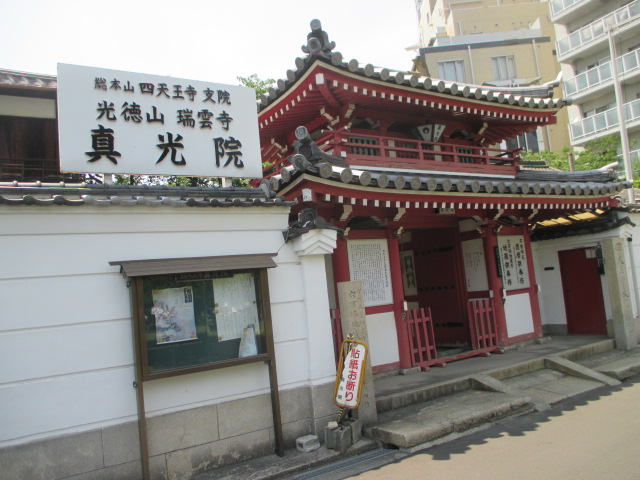谷町筋にあるお寺さんで、「総本山 四天王寺の支院 光徳山 瑞雲寺 真光院」と看板に大きな字で書いてありました。寺門や欄干や屋根にアクセントみたいにして入っている朱色がとてもいいです。天王寺から出ている100円バスに乗るとすぐに行けます。